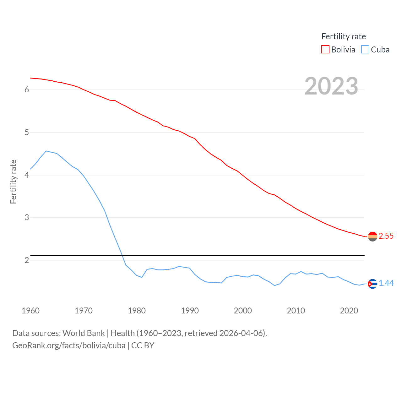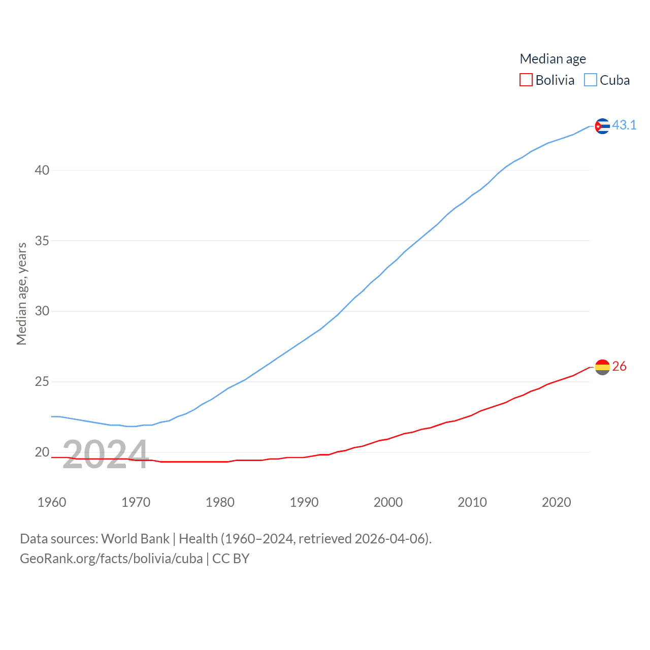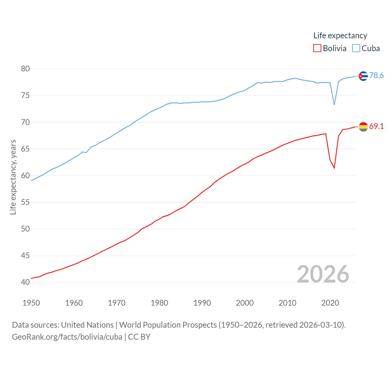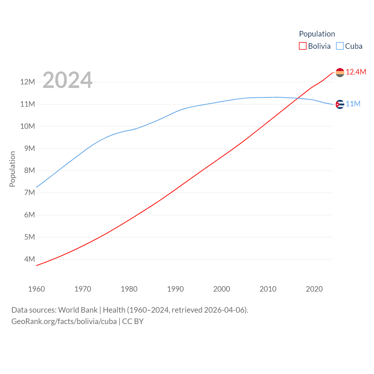 Bolivia has a population of 12.4M (ranked 79/197), compared with 11M in Cuba (ranked 87/197). Bolivia's land area is 418,264 sq mi versus 40,077 sq mi for Cuba (ranked 27th vs. 103rd).