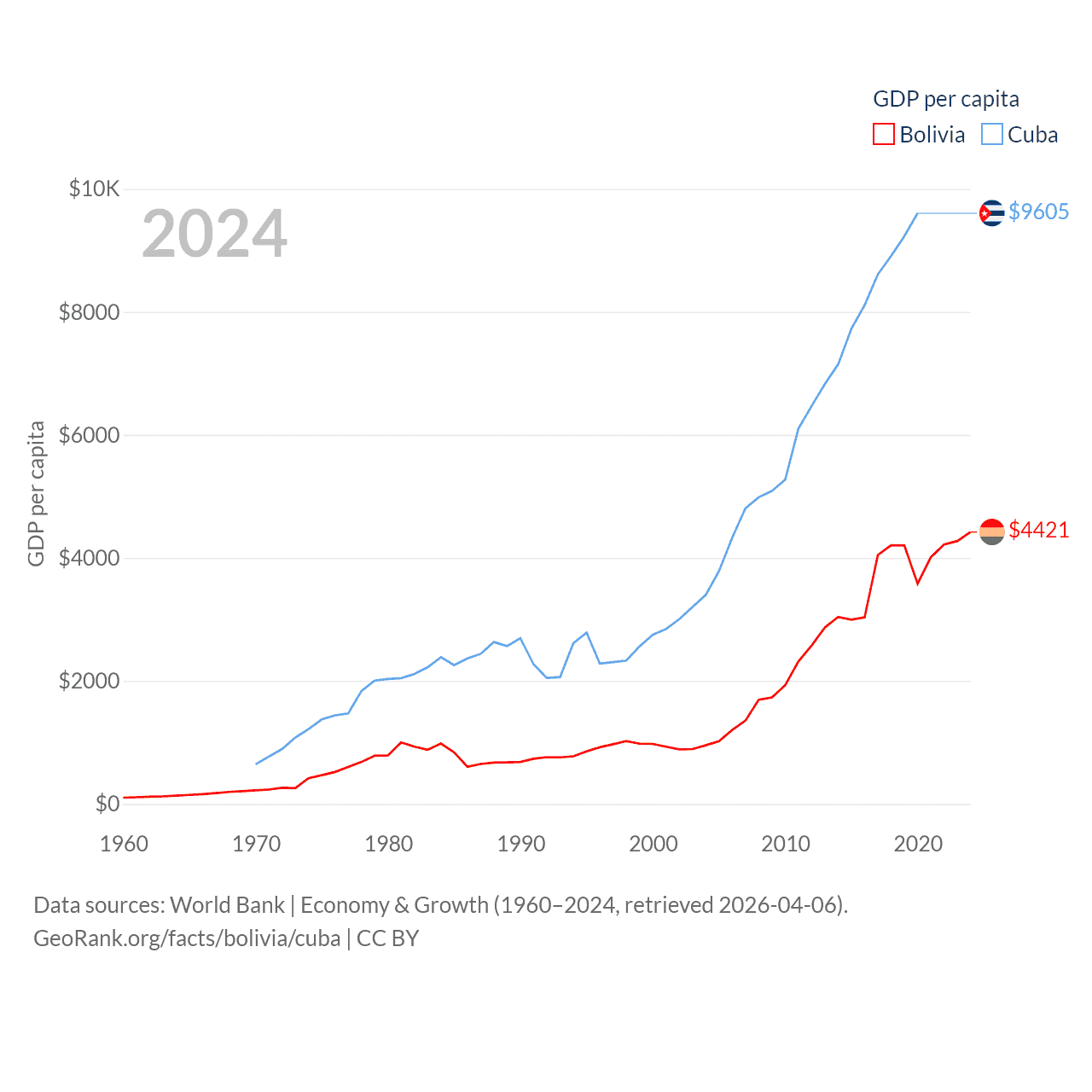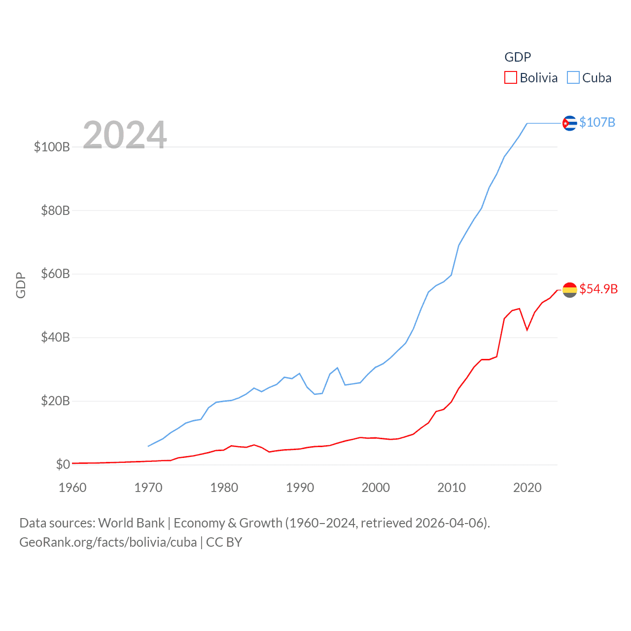 By GDP, Bolivia ranks 88/197 ($54.9B) and Cuba ranks 69/197 ($107B). By GDP per capita, Bolivia ranks 125/197 ($4,421), while Cuba ranks 86/197 ($9,605).