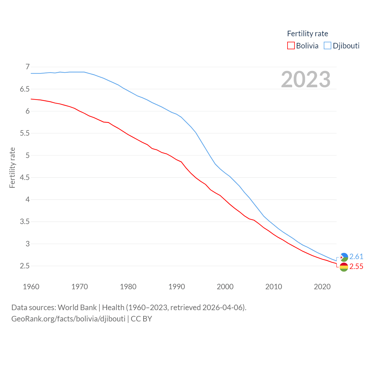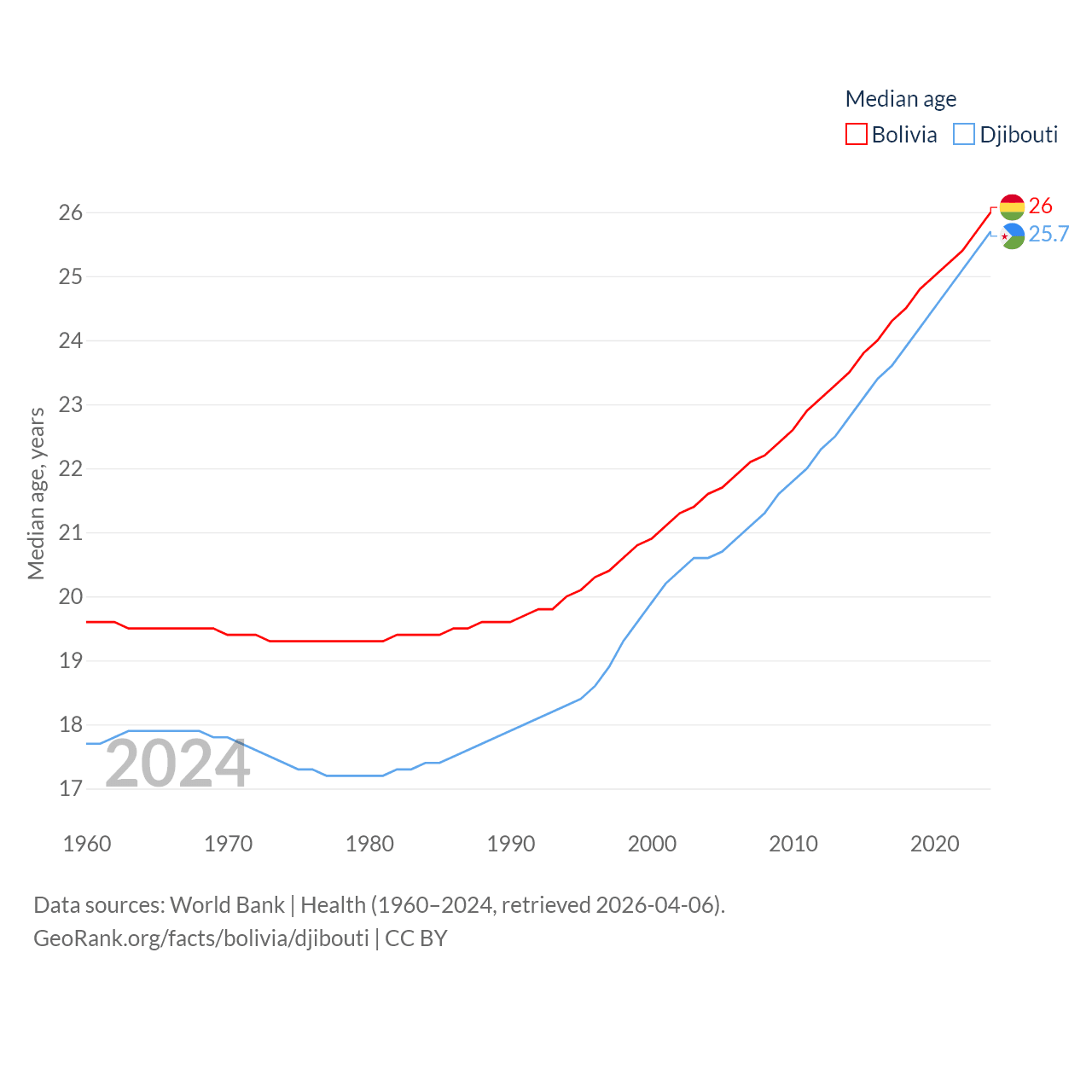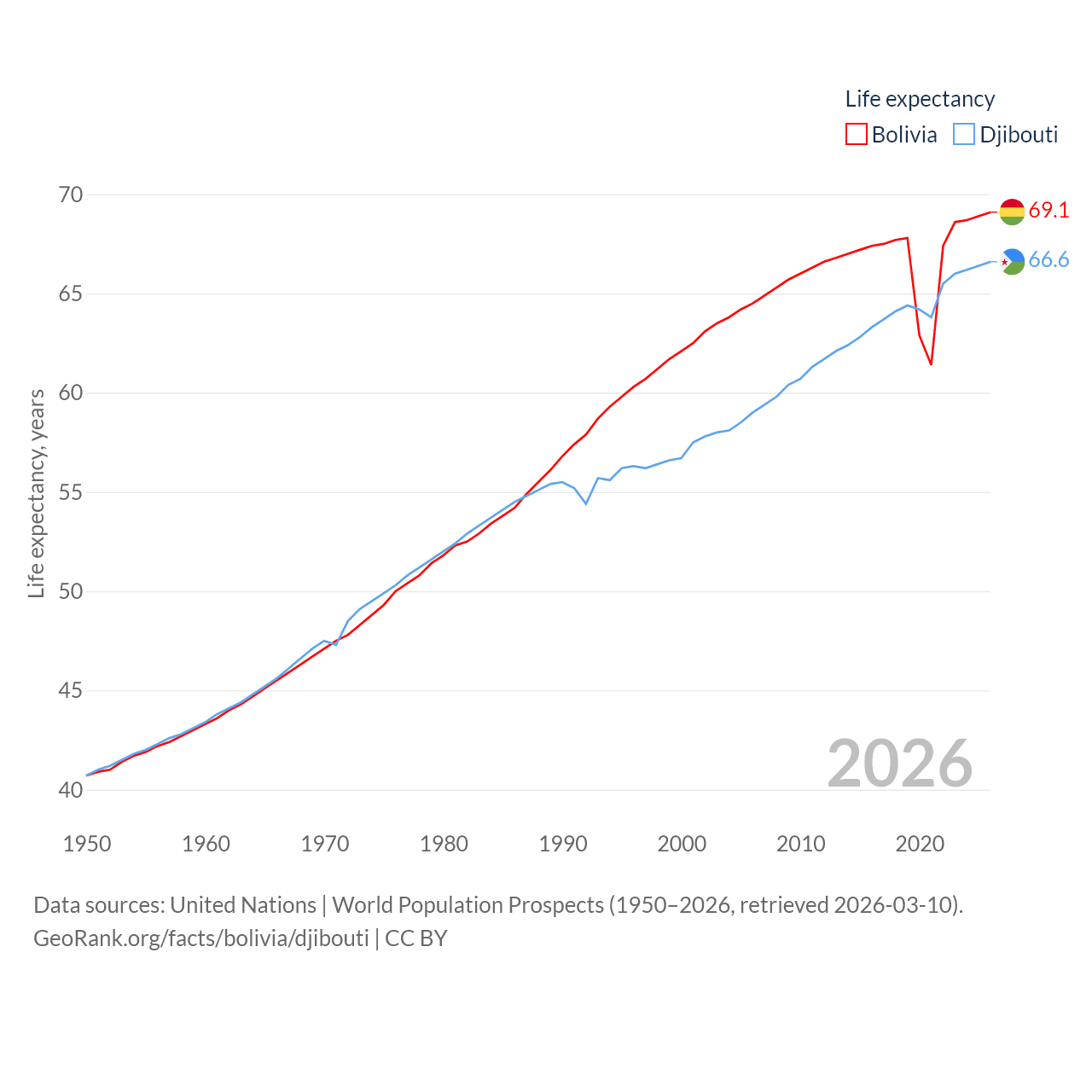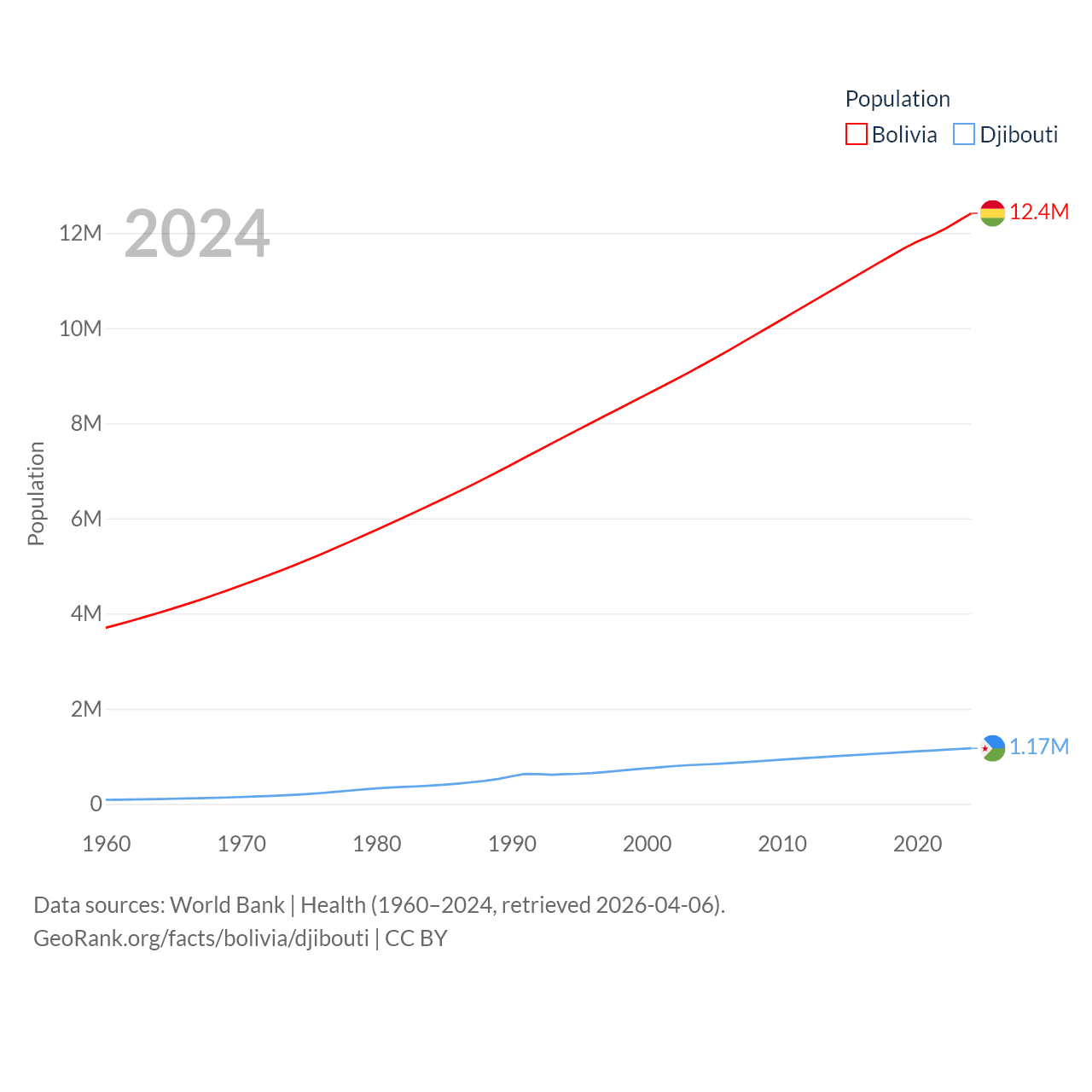 Bolivia has a population of 12.4M (ranked 79/197), compared with 1.17M in Djibouti (ranked 158/197). Bolivia's land area is 418,264 sq mi versus 8,950 sq mi for Djibouti (ranked 27th vs. 147th).