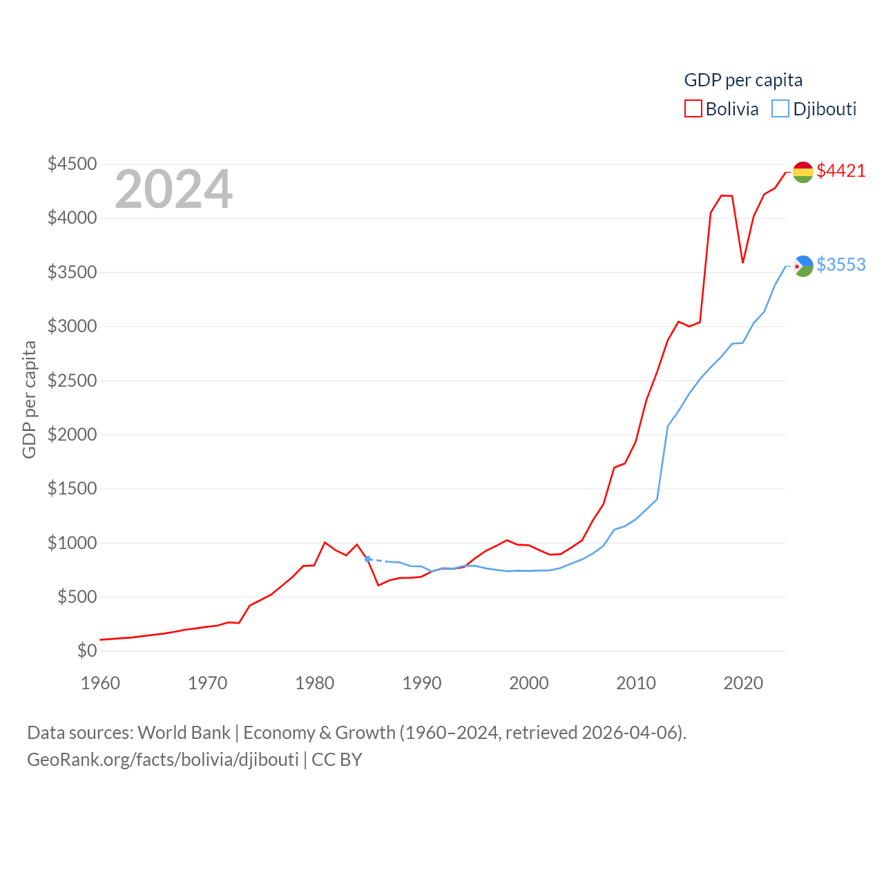 By GDP, Bolivia ranks 88/197 ($54.9B) and Djibouti ranks 165/197 ($4.15B). By GDP per capita, Bolivia ranks 125/197 ($4,421), while Djibouti ranks 133/197 ($3,553).