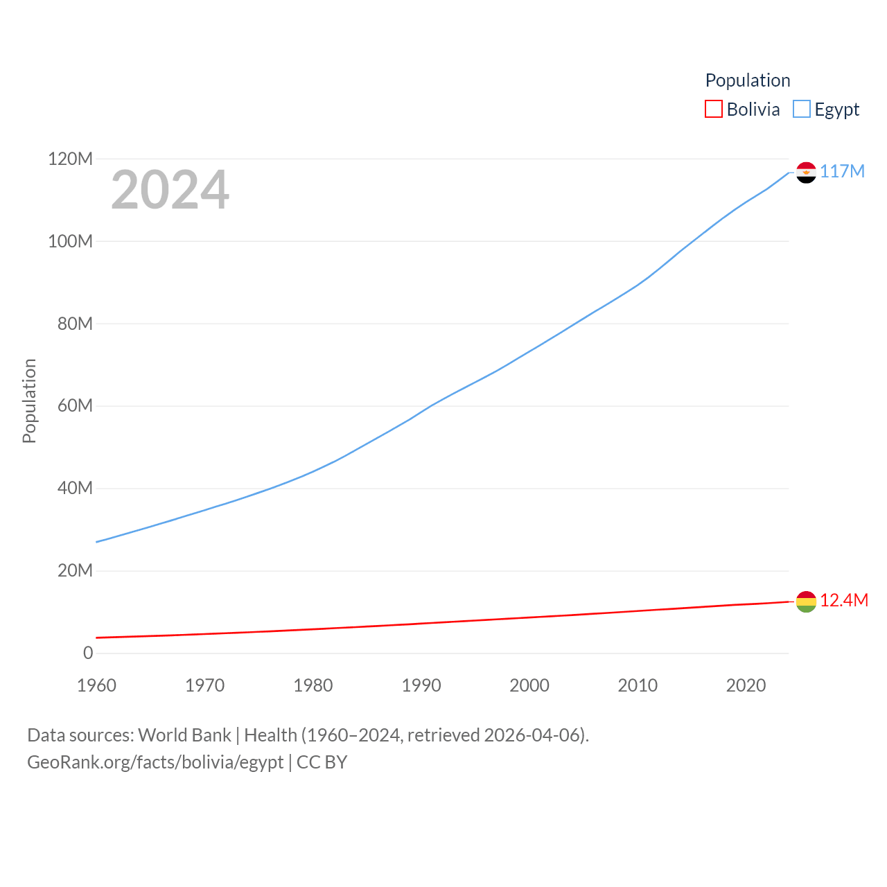 Bolivia has a population of 12.4M (ranked 79/197), compared with 117M in Egypt (ranked 13/197). Bolivia's land area is 418,264 sq mi versus 384,345 sq mi for Egypt (ranked 27th vs. 29th).