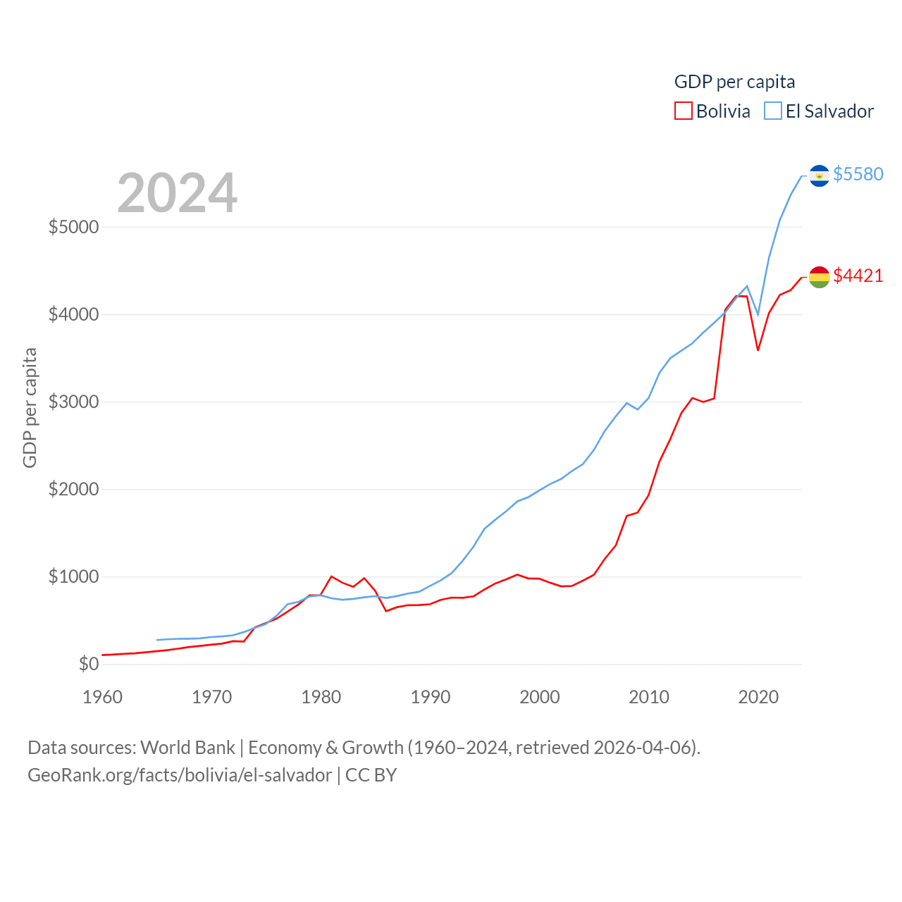 By GDP, Bolivia ranks 88/197 ($54.9B) and El Salvador ranks 105/197 ($35.4B). By GDP per capita, Bolivia ranks 125/197 ($4,421), while El Salvador ranks 116/197 ($5,580).