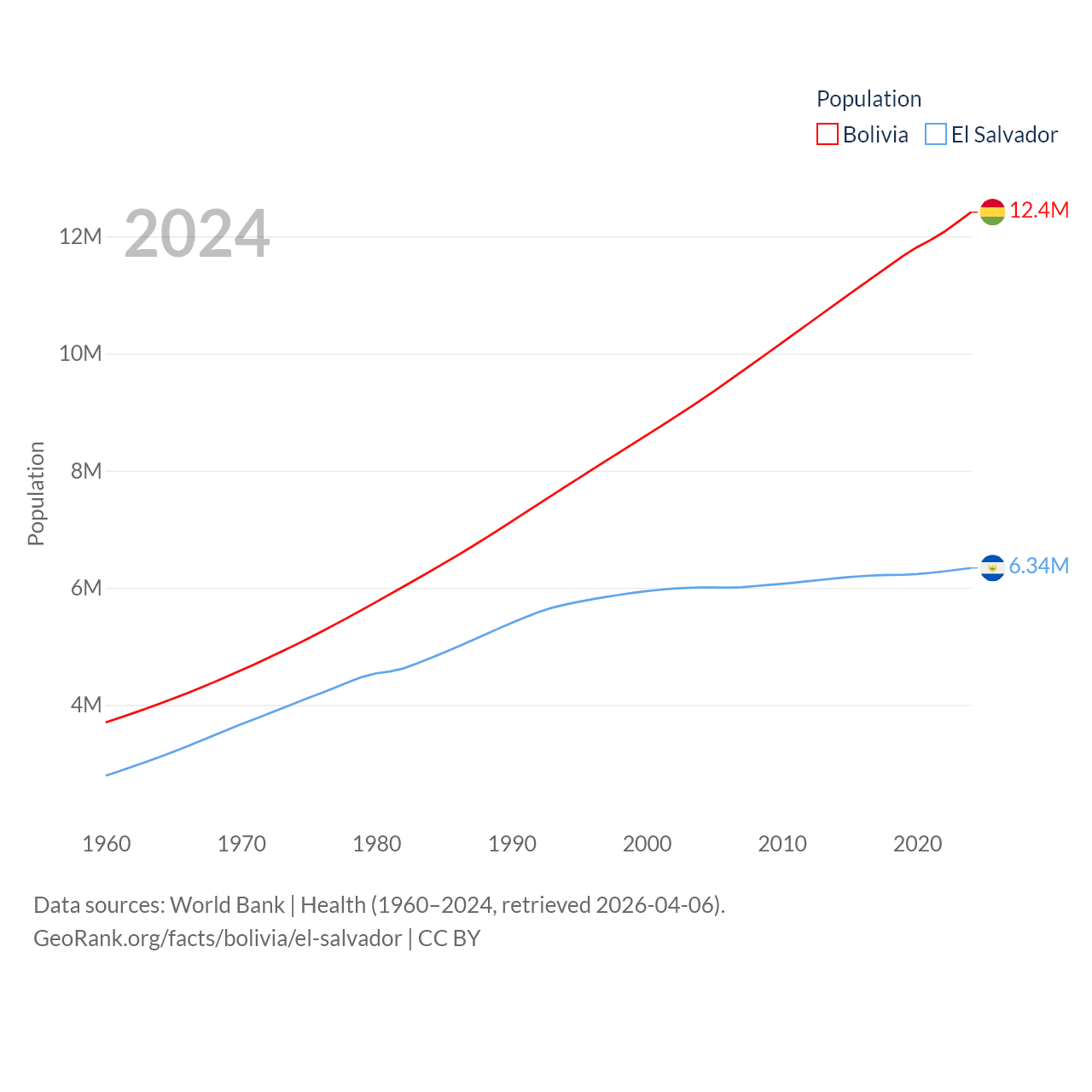 Bolivia has a population of 12.4M (ranked 79/197), compared with 6.34M in El Salvador (ranked 111/197). Bolivia's land area is 418,264 sq mi versus 8,000 sq mi for El Salvador (ranked 27th vs. 150th).