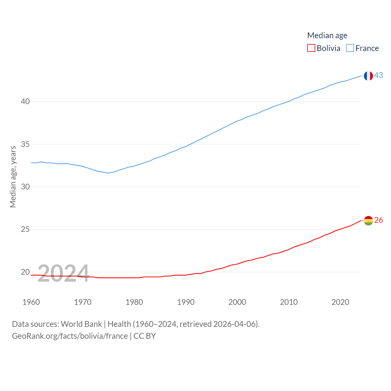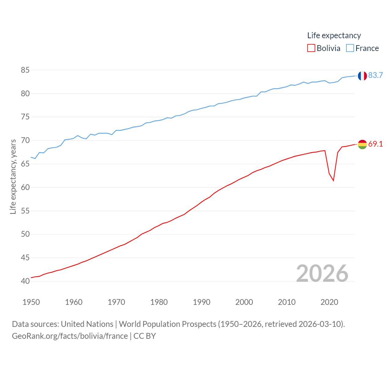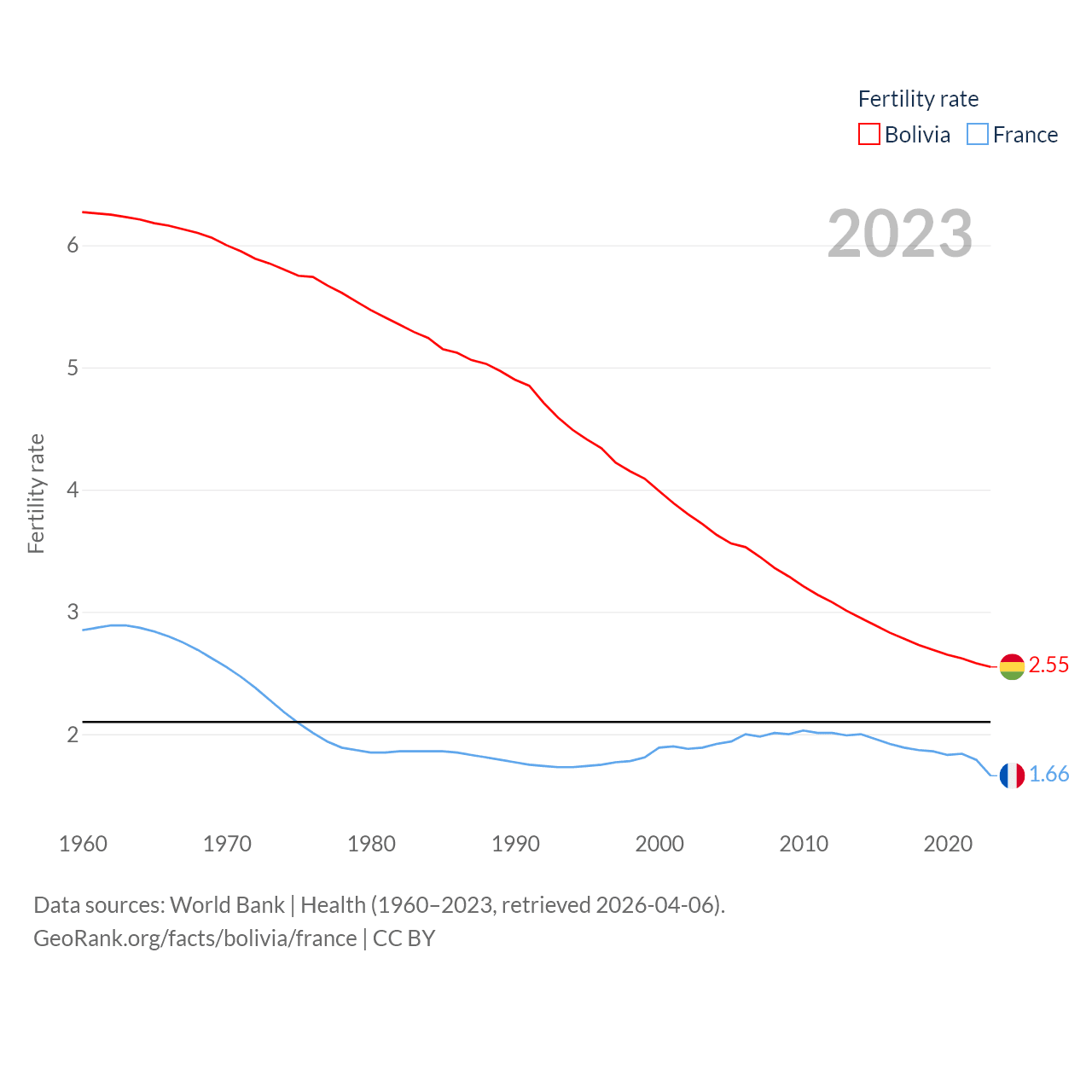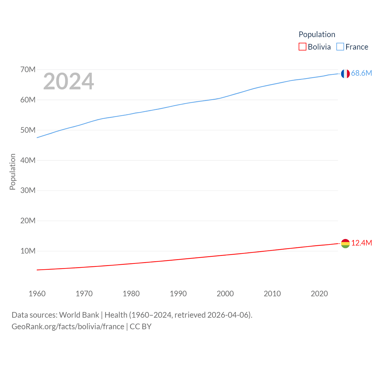Bolivia has a population of 12.4M (ranked 79/197), compared with 68.6M in France (ranked 23/197). Bolivia's land area is 418,264 sq mi versus 208,090 sq mi for France (ranked 27th vs. 48th).