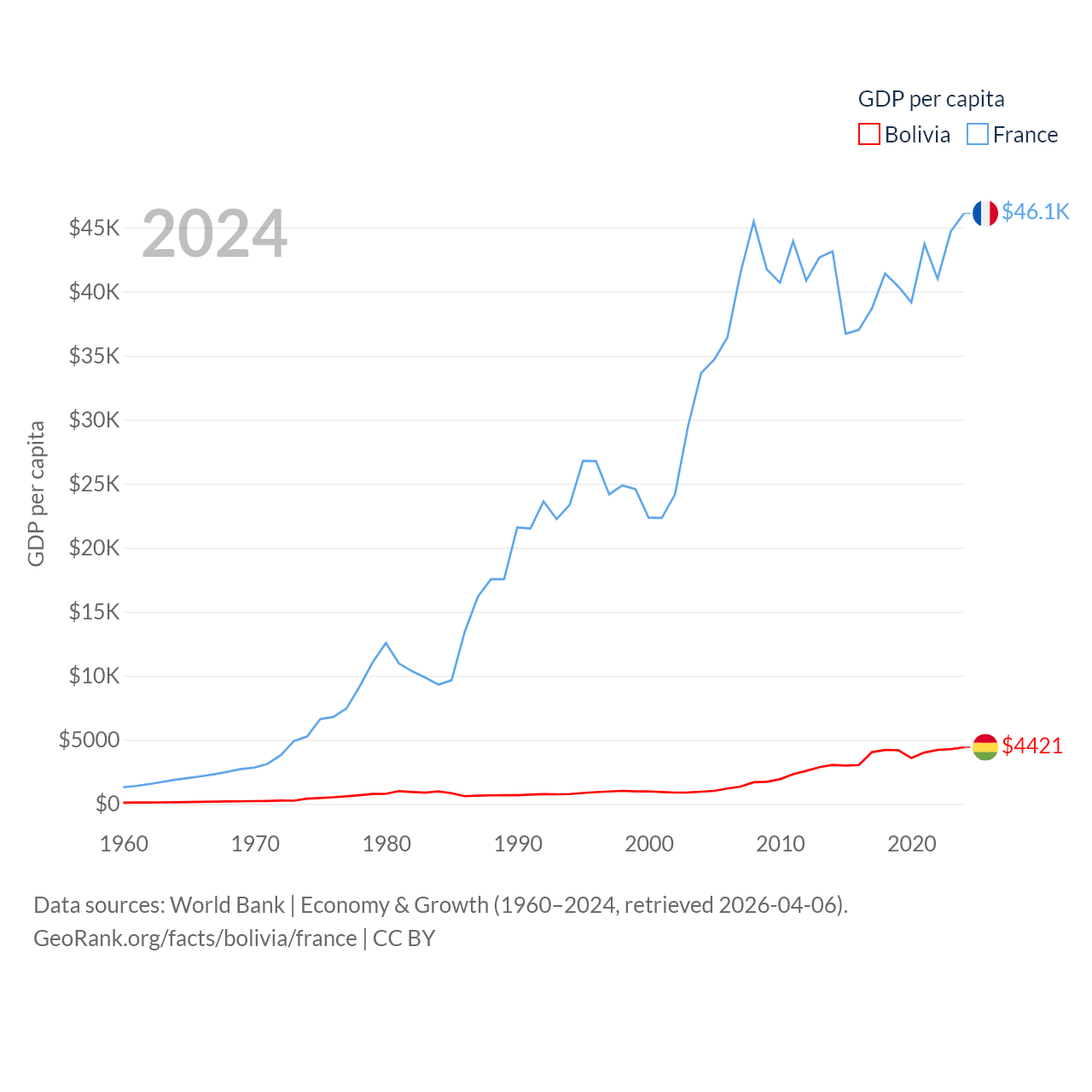 By GDP, Bolivia ranks 88/197 ($54.9B) and France ranks 7/197 ($3.16T). By GDP per capita, Bolivia ranks 125/197 ($4,421), while France ranks 27/197 ($46,103).