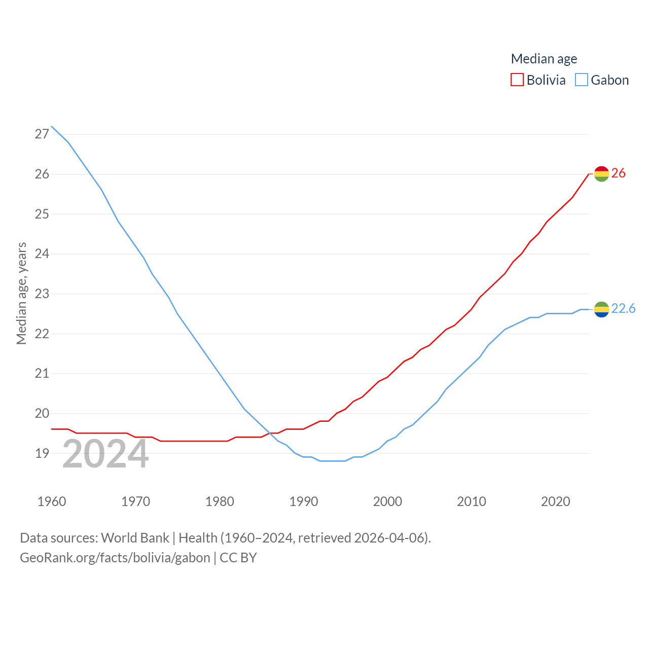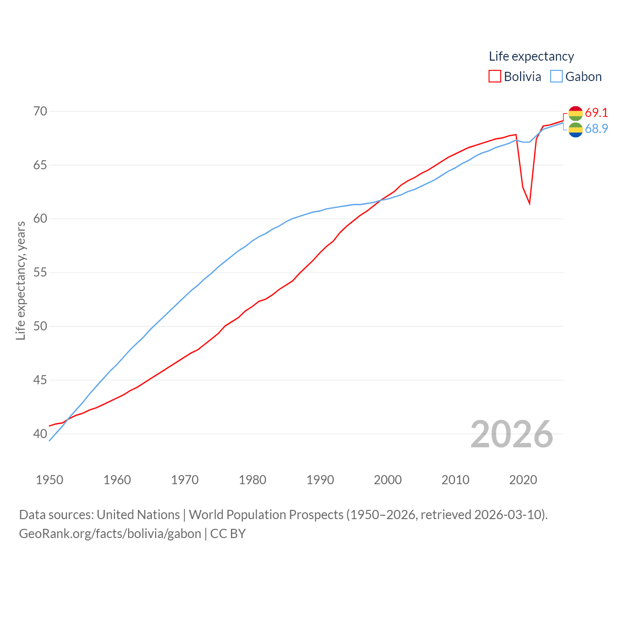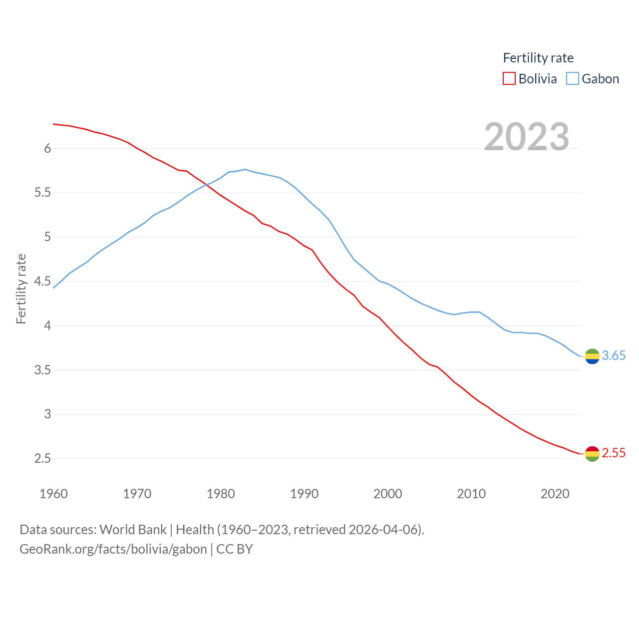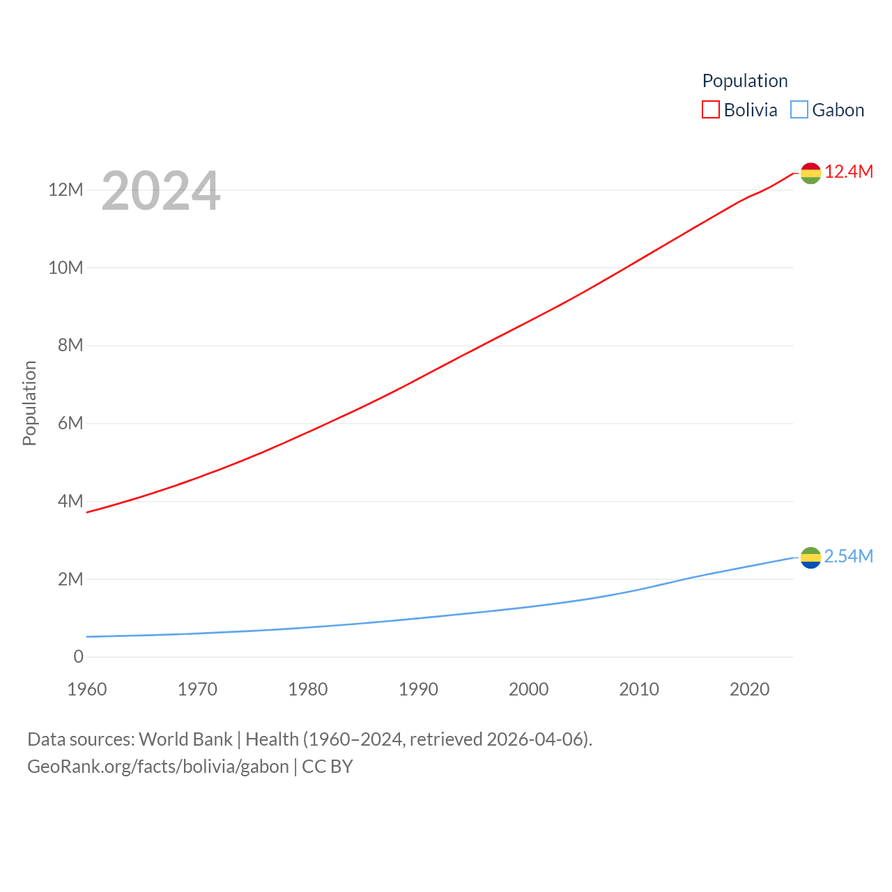 Bolivia has a population of 12.4M (ranked 79/197), compared with 2.54M in Gabon (ranked 141/197). Bolivia's land area is 418,264 sq mi versus 99,487 sq mi for Gabon (ranked 27th vs. 75th).