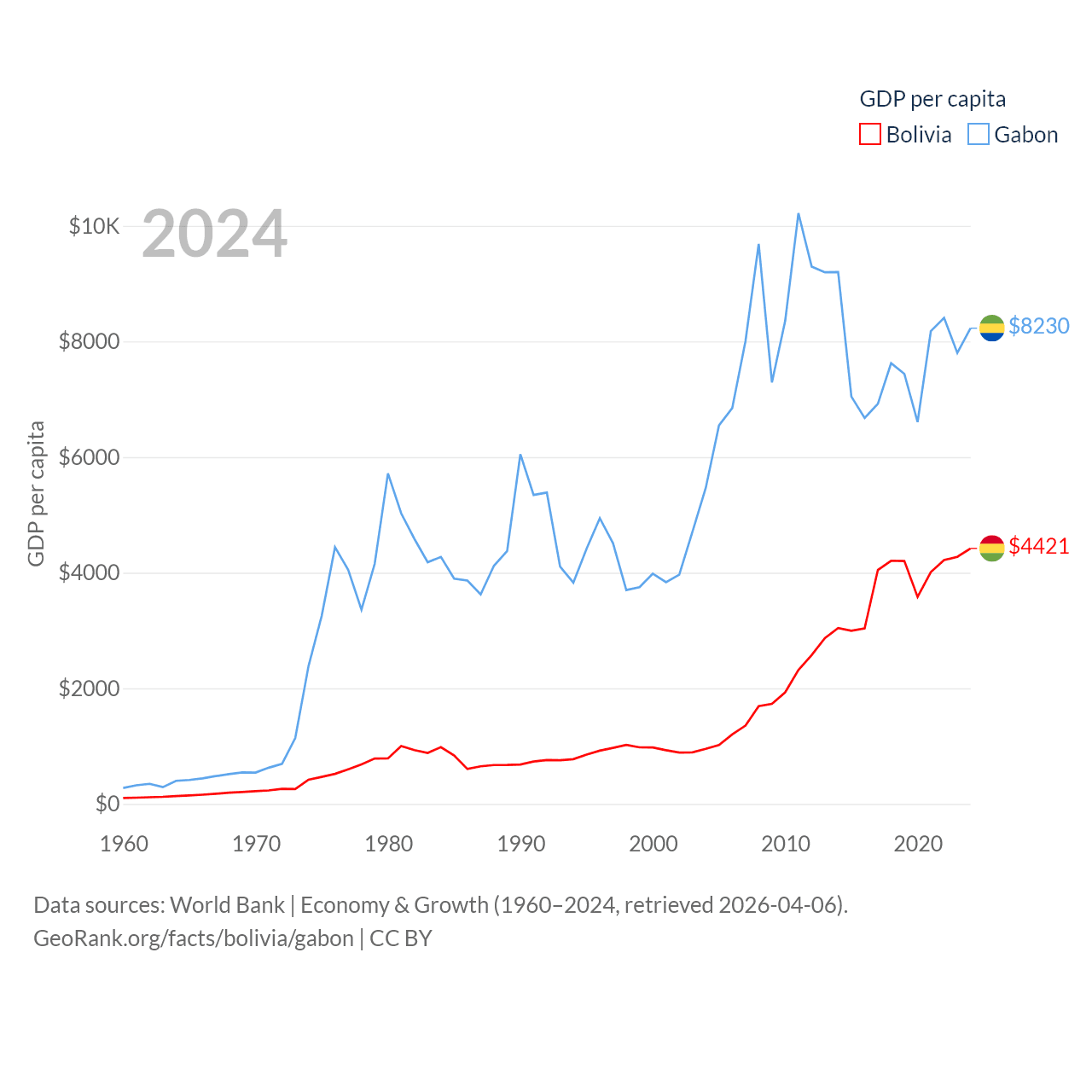 By GDP, Bolivia ranks 88/197 ($54.9B) and Gabon ranks 127/197 ($20.9B). By GDP per capita, Bolivia ranks 125/197 ($4,421), while Gabon ranks 93/197 ($8,230).
