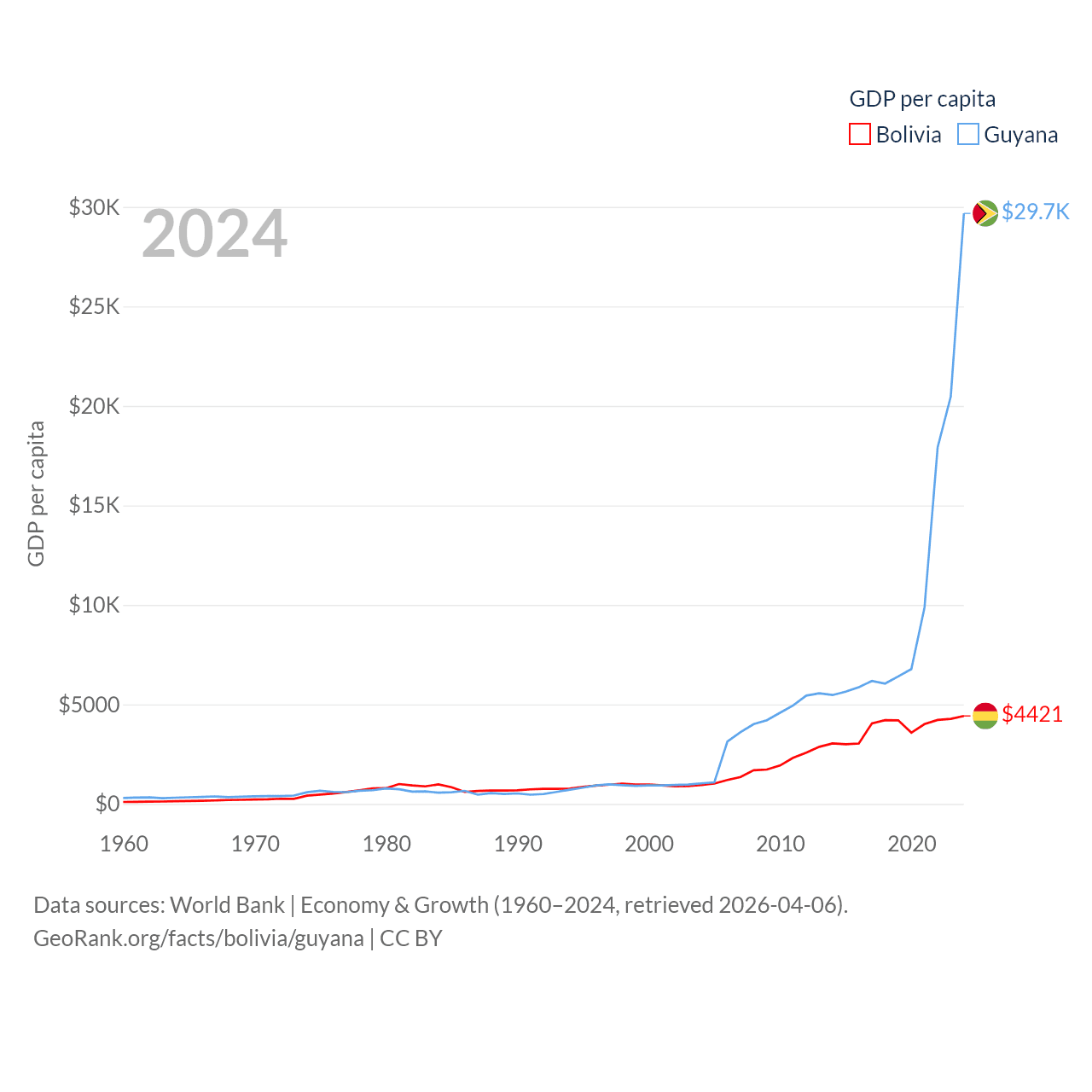 By GDP, Bolivia ranks 88/197 ($54.9B) and Guyana ranks 120/197 ($24.7B). By GDP per capita, Bolivia ranks 125/197 ($4,421), while Guyana ranks 41/197 ($29,675).