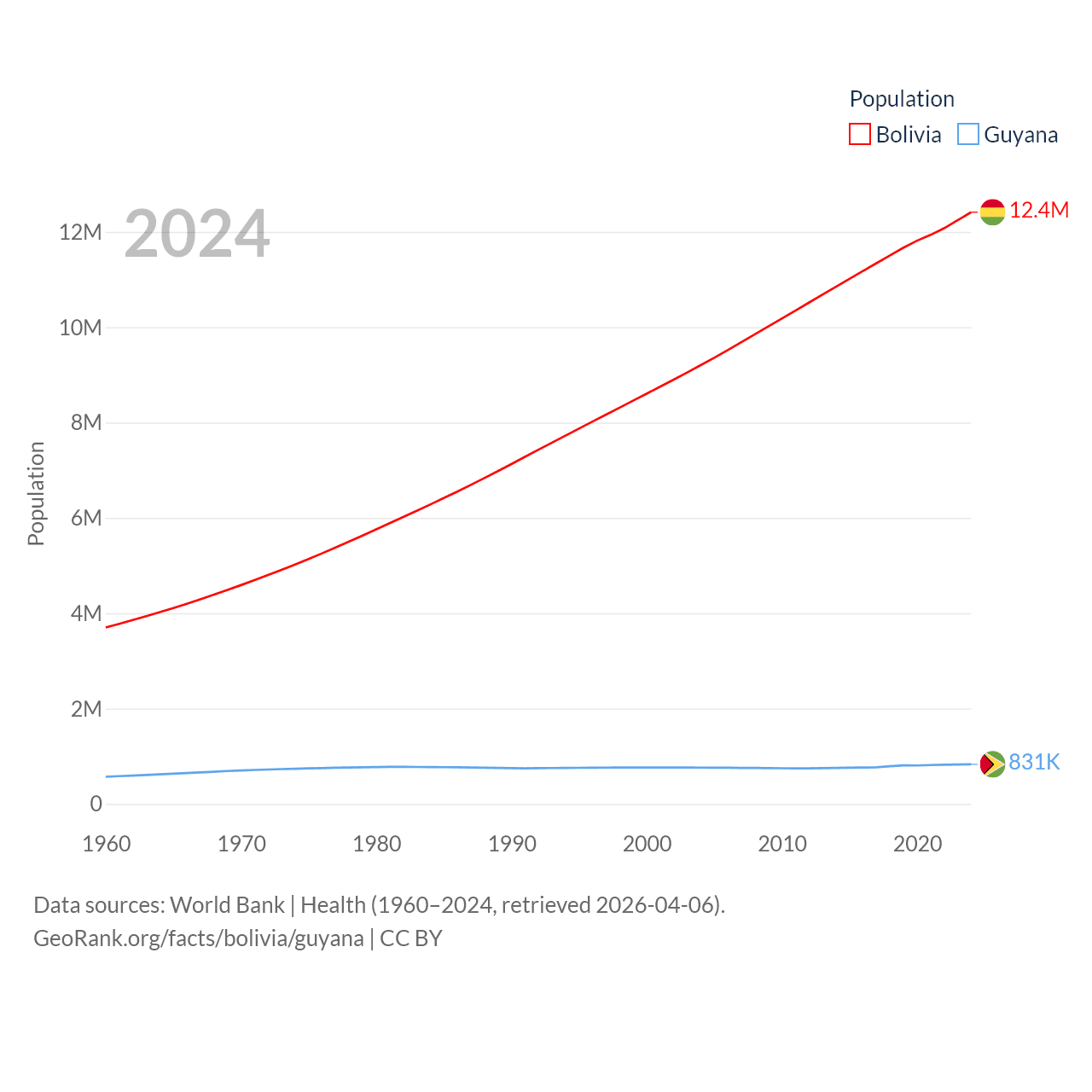 Bolivia has a population of 12.4M (ranked 79/197), compared with 831K in Guyana (ranked 161/197). Bolivia's land area is 418,264 sq mi versus 81,522 sq mi for Guyana (ranked 27th vs. 82nd).