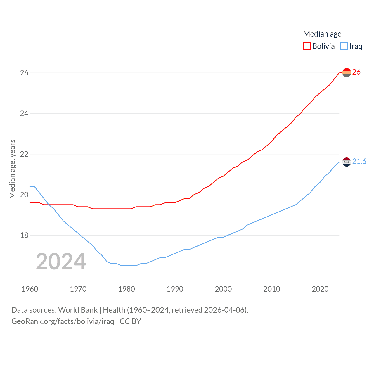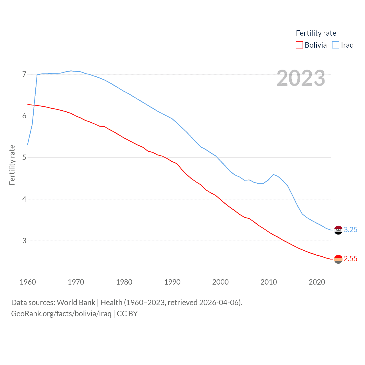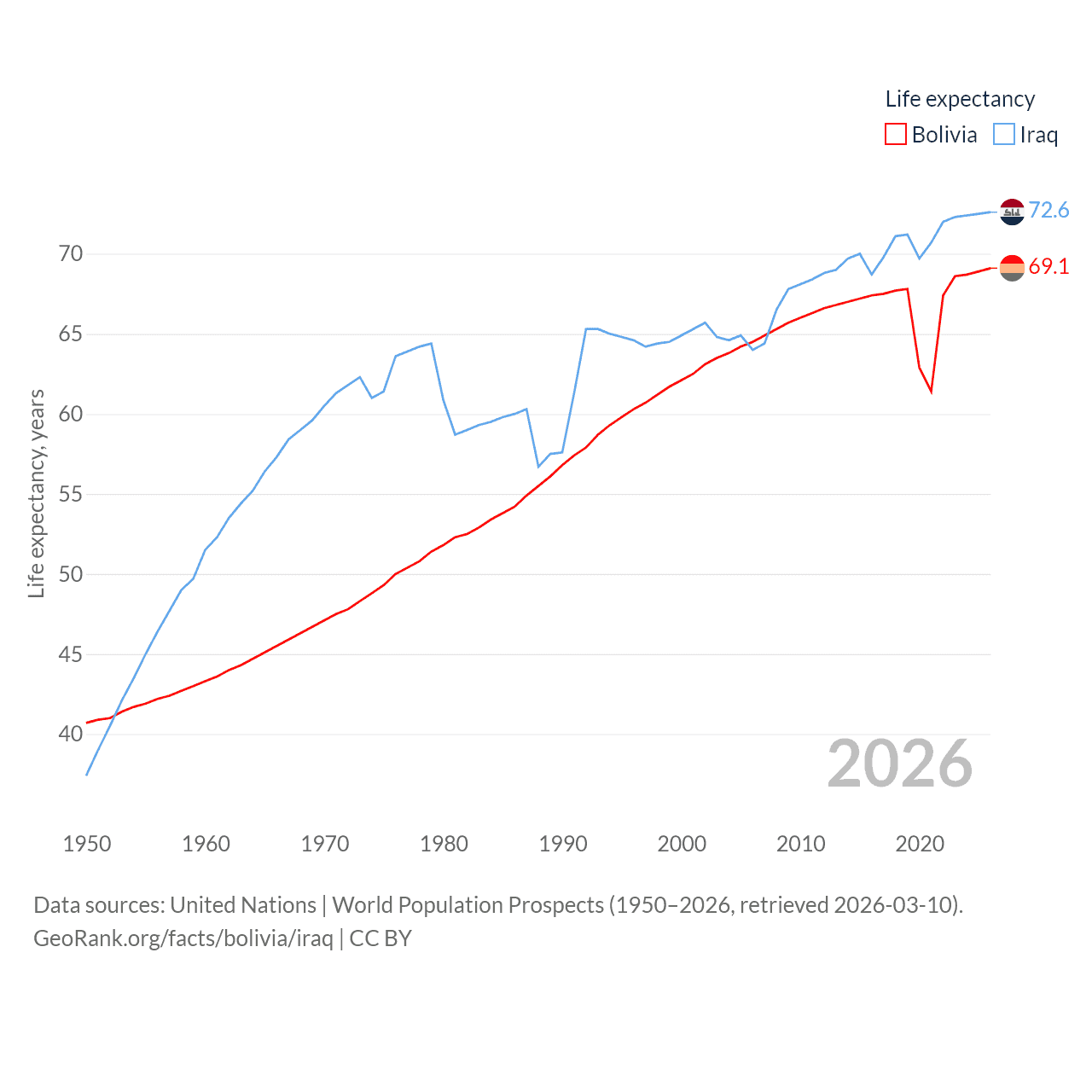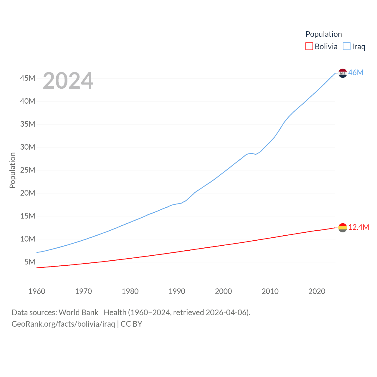 Bolivia has a population of 12.4M (ranked 79/197), compared with 46M in Iraq (ranked 34/197). Bolivia's land area is 418,264 sq mi versus 167,619 sq mi for Iraq (ranked 27th vs. 57th).