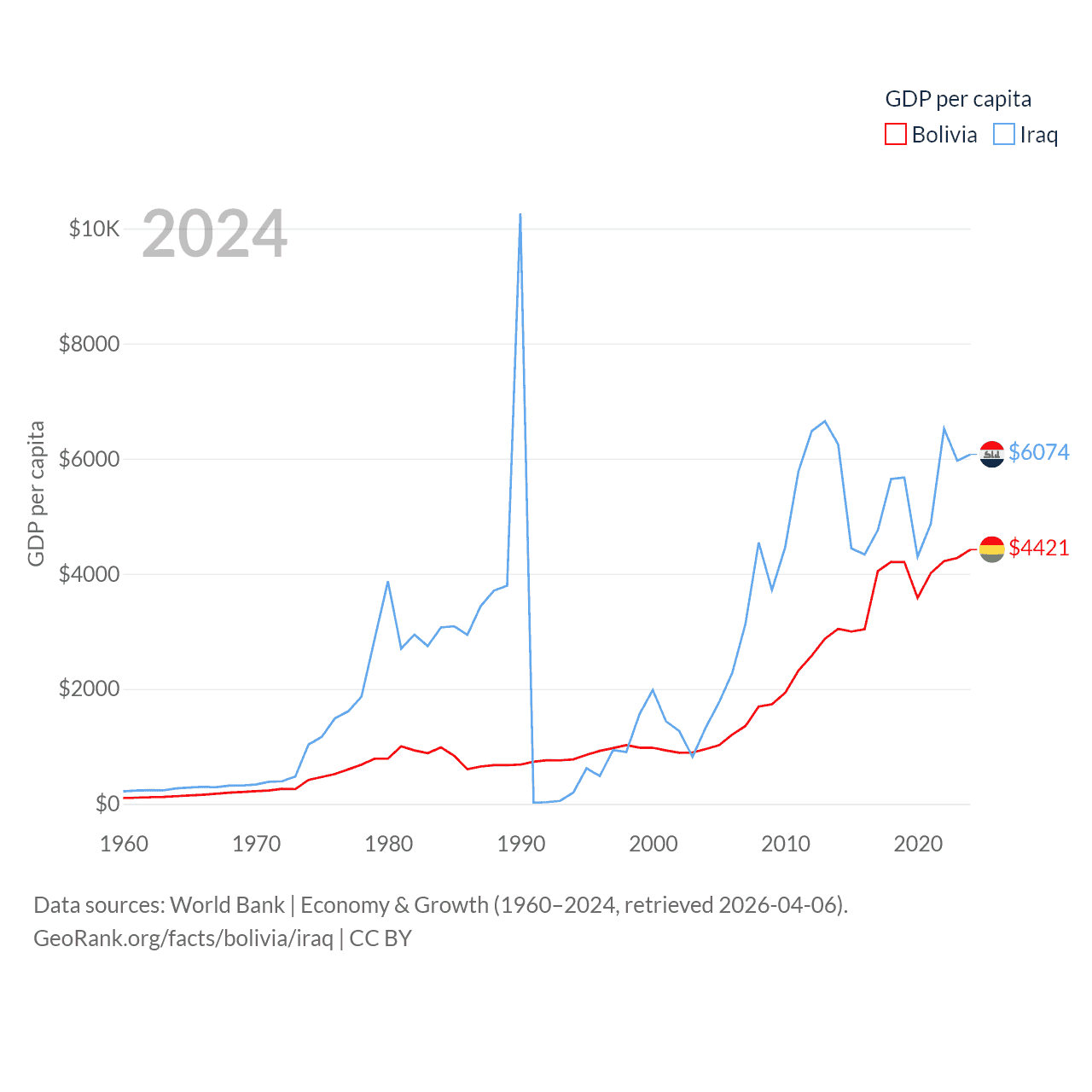 By GDP, Bolivia ranks 88/197 ($54.9B) and Iraq ranks 50/197 ($280B). By GDP per capita, Bolivia ranks 125/197 ($4,421), while Iraq ranks 113/197 ($6,074).