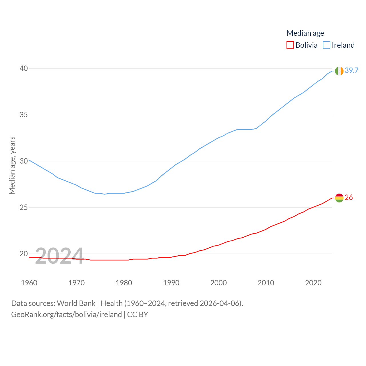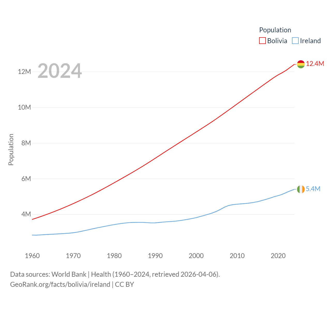 Bolivia has a population of 12.4M (ranked 79/197), compared with 5.4M in Ireland (ranked 120/197). Bolivia's land area is 418,264 sq mi versus 26,599 sq mi for Ireland (ranked 27th vs. 119th).