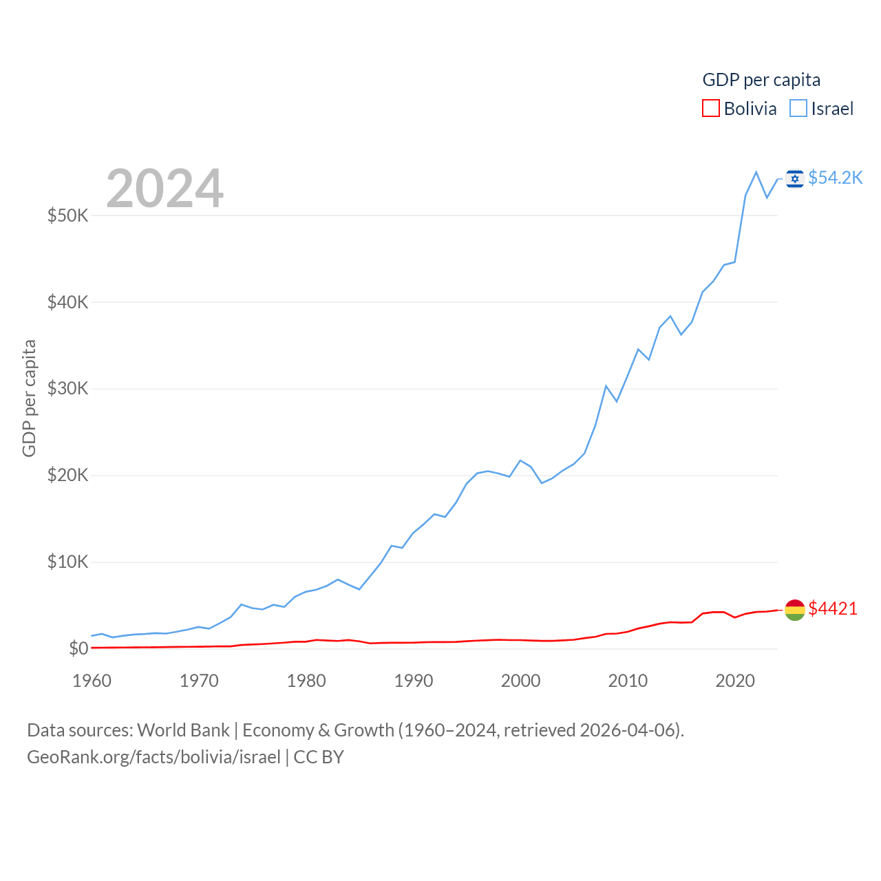 By GDP, Bolivia ranks 88/197 ($54.9B) and Israel ranks 29/197 ($540B). By GDP per capita, Bolivia ranks 125/197 ($4,421), while Israel ranks 21/197 ($54,177).