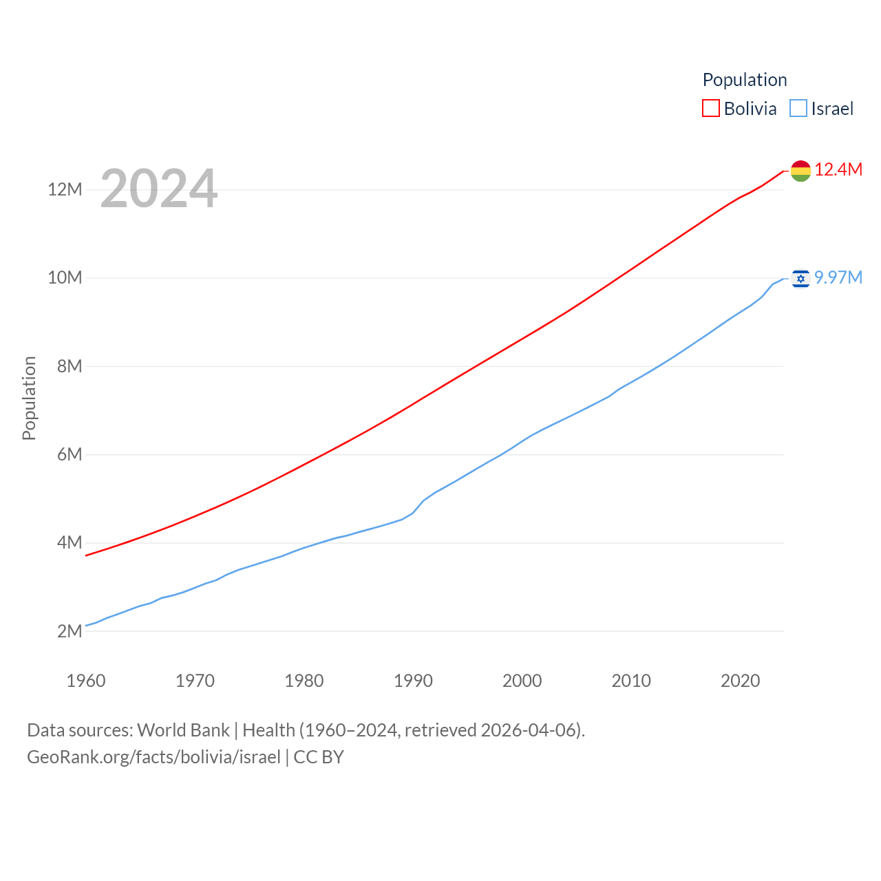 Bolivia has a population of 12.4M (ranked 79/197), compared with 9.97M in Israel (ranked 96/197). Bolivia's land area is 418,264 sq mi versus 8,355 sq mi for Israel (ranked 27th vs. 149th).