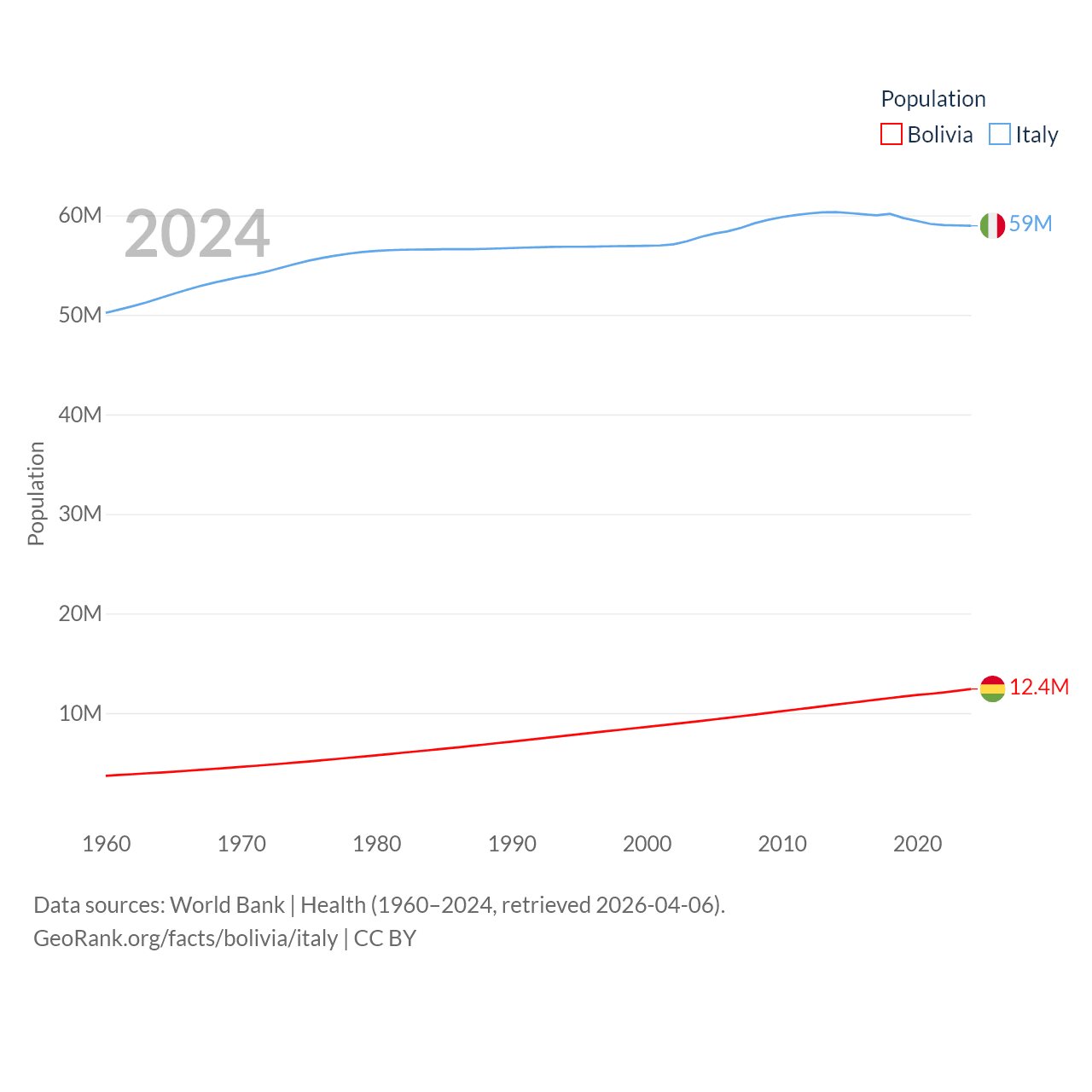 Bolivia has a population of 12.4M (ranked 79/197), compared with 59M in Italy (ranked 25/197). Bolivia's land area is 418,264 sq mi versus 114,178 sq mi for Italy (ranked 27th vs. 72nd).