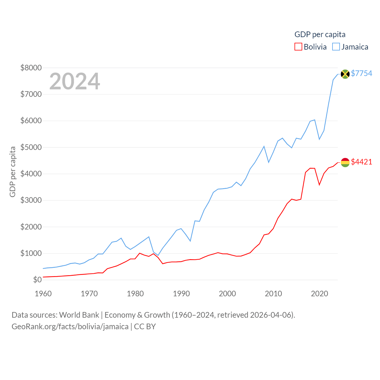 By GDP, Bolivia ranks 88/197 ($54.9B) and Jamaica ranks 124/197 ($22B). By GDP per capita, Bolivia ranks 125/197 ($4,421), while Jamaica ranks 95/197 ($7,754).