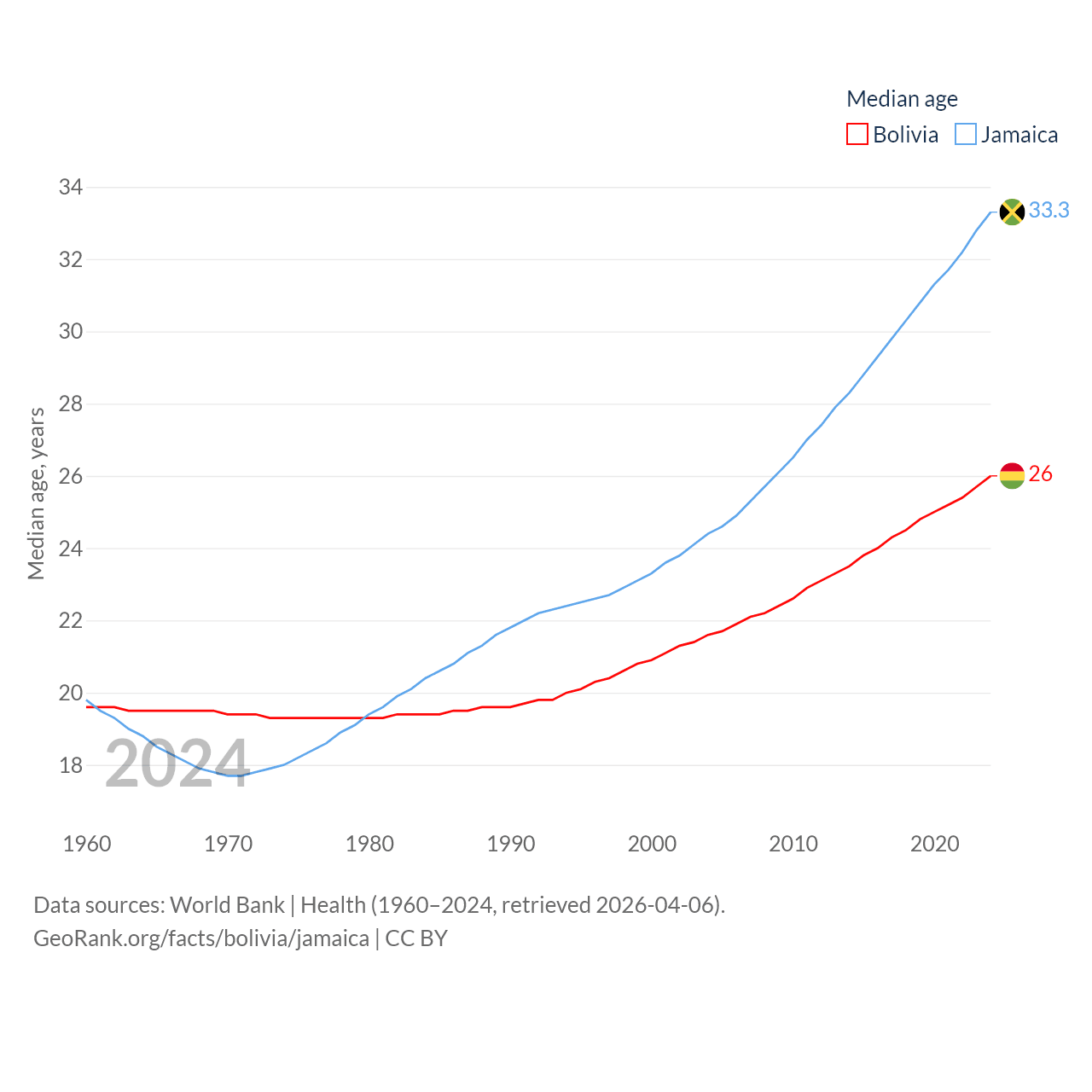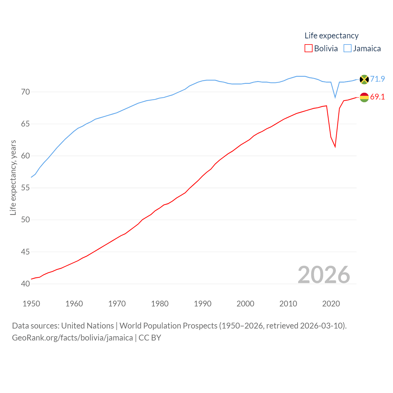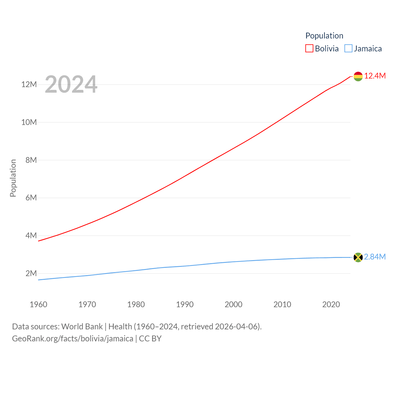 Bolivia has a population of 12.4M (ranked 79/197), compared with 2.84M in Jamaica (ranked 139/197). Bolivia's land area is 418,264 sq mi versus 4,181 sq mi for Jamaica (ranked 27th vs. 159th).