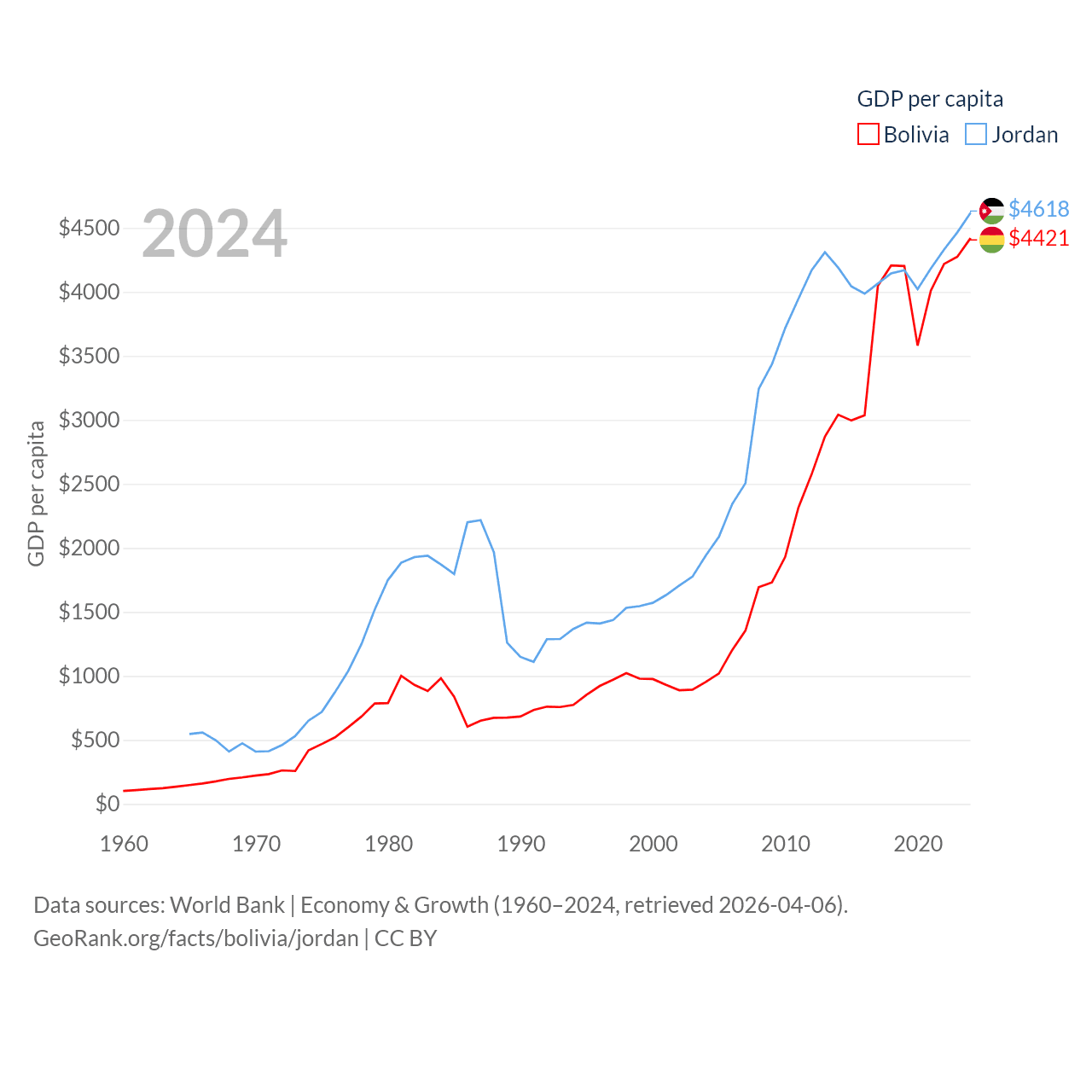 By GDP, Bolivia ranks 88/197 ($54.9B) and Jordan ranks 90/197 ($53.4B). By GDP per capita, Bolivia ranks 125/197 ($4,421), while Jordan ranks 123/197 ($4,618).