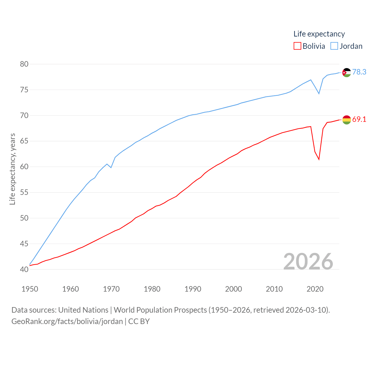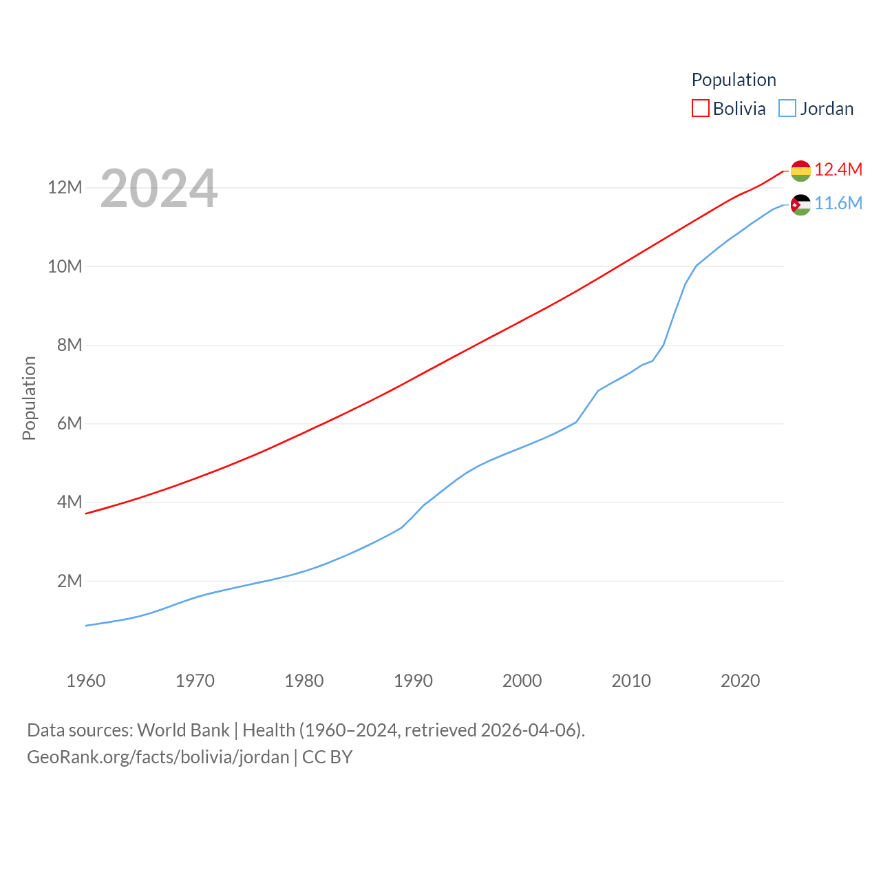 Bolivia has a population of 12.4M (ranked 79/197), compared with 11.6M in Jordan (ranked 84/197). Bolivia's land area is 418,264 sq mi versus 34,284 sq mi for Jordan (ranked 27th vs. 110th).