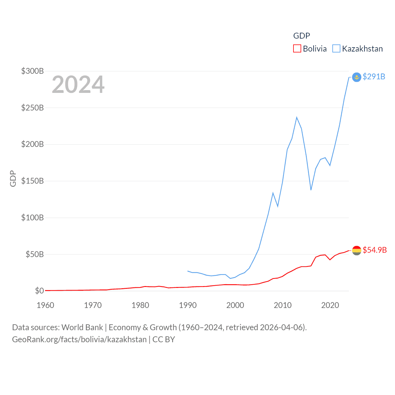 By GDP, Bolivia ranks 88/197 ($54.9B) and Kazakhstan ranks 48/197 ($291B). By GDP per capita, Bolivia ranks 125/197 ($4,421), while Kazakhstan ranks 71/197 ($14,155).