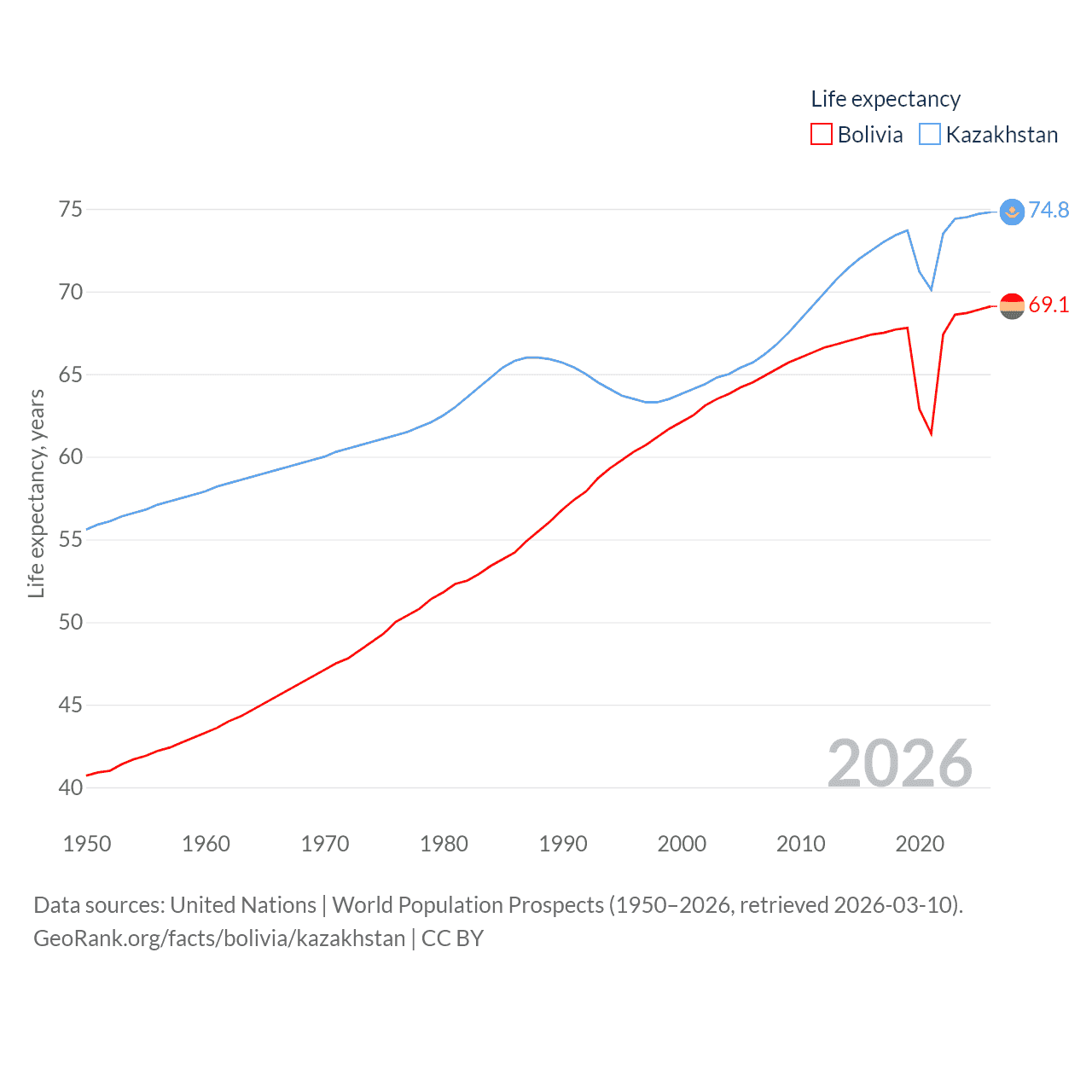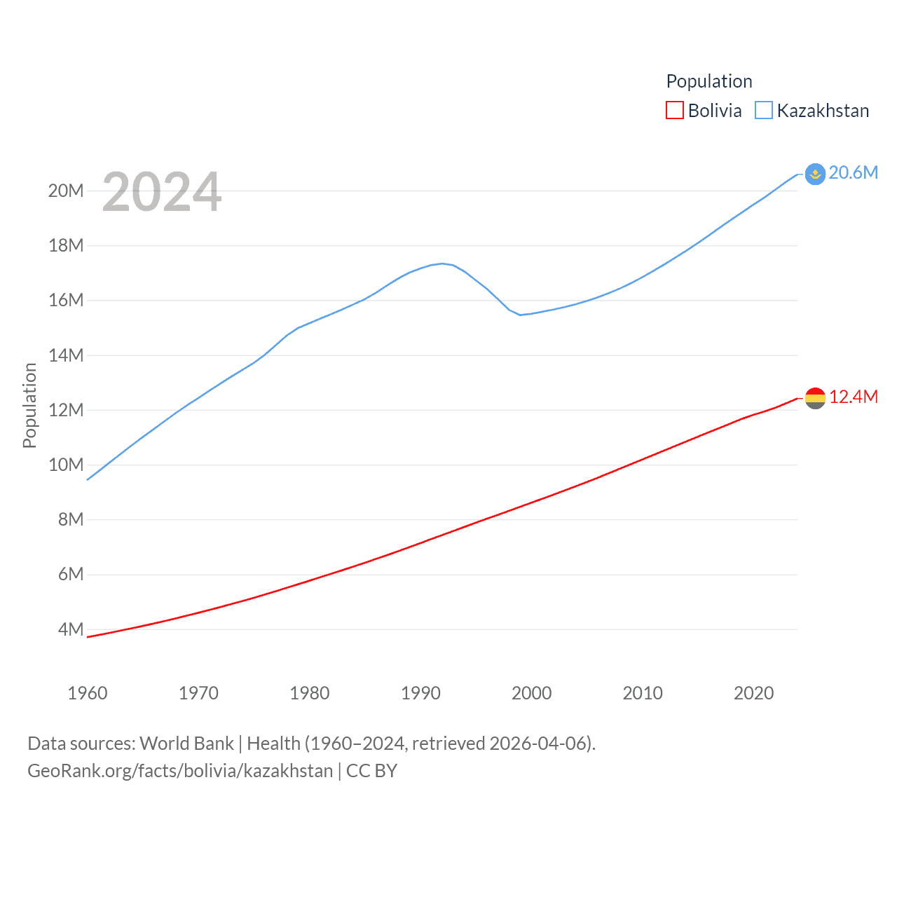 Bolivia has a population of 12.4M (ranked 79/197), compared with 20.6M in Kazakhstan (ranked 64/197). Bolivia's land area is 418,264 sq mi versus 1,042,360 sq mi for Kazakhstan (ranked 27th vs. 9th).