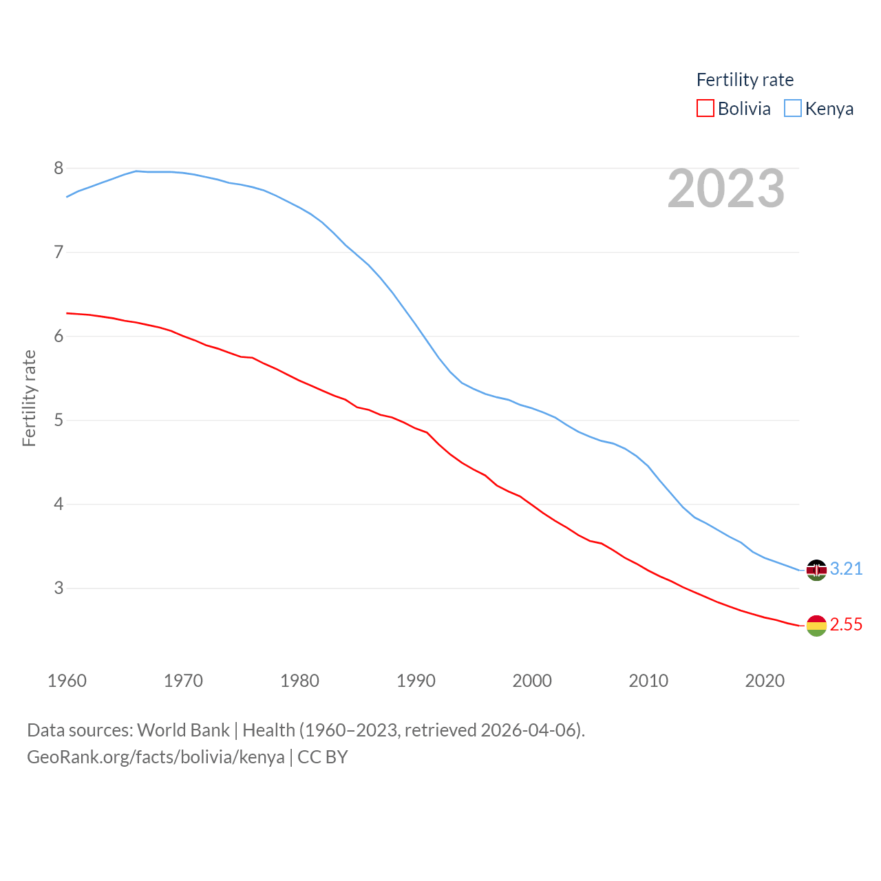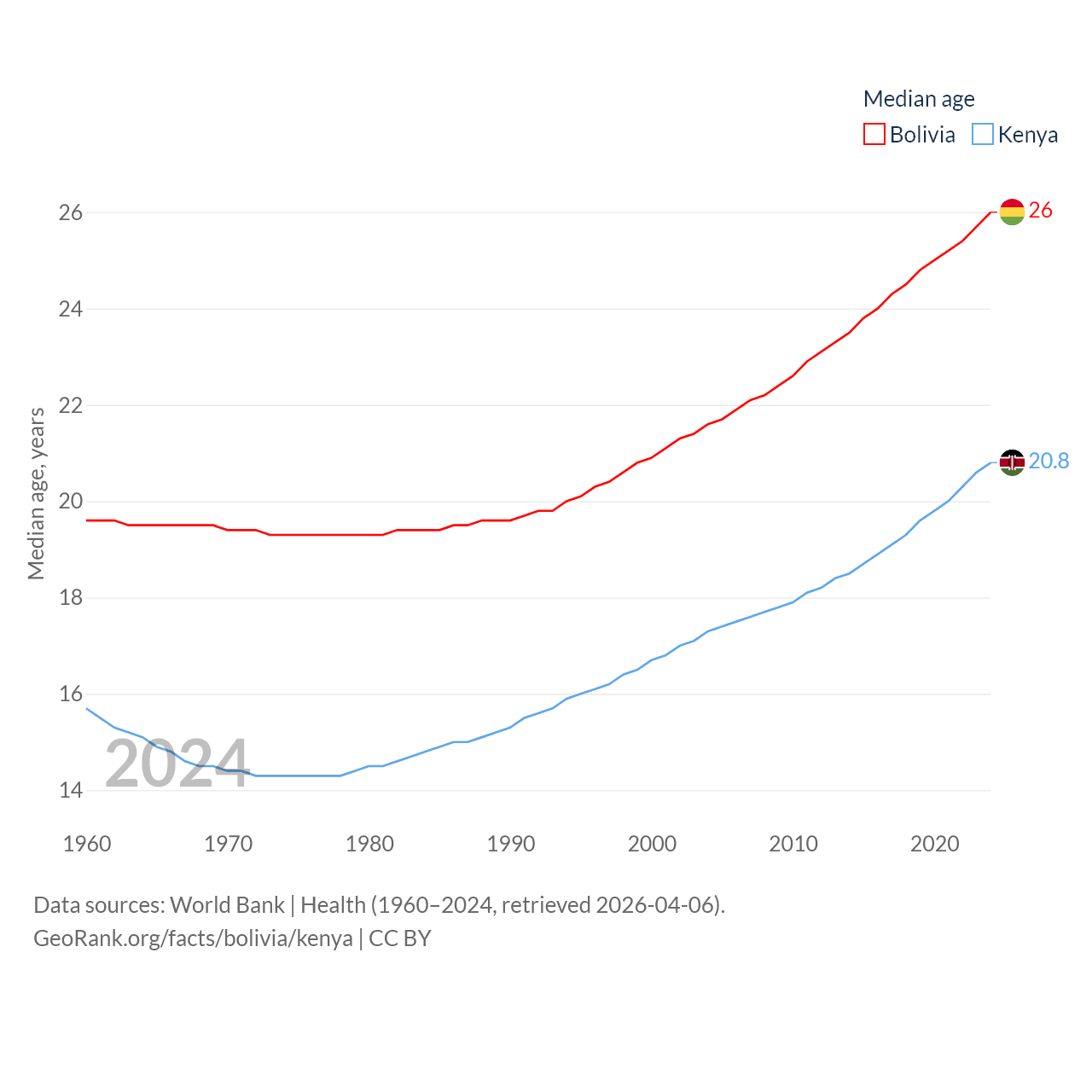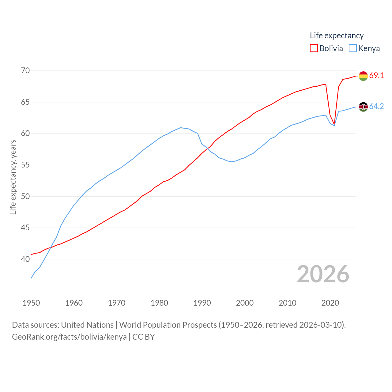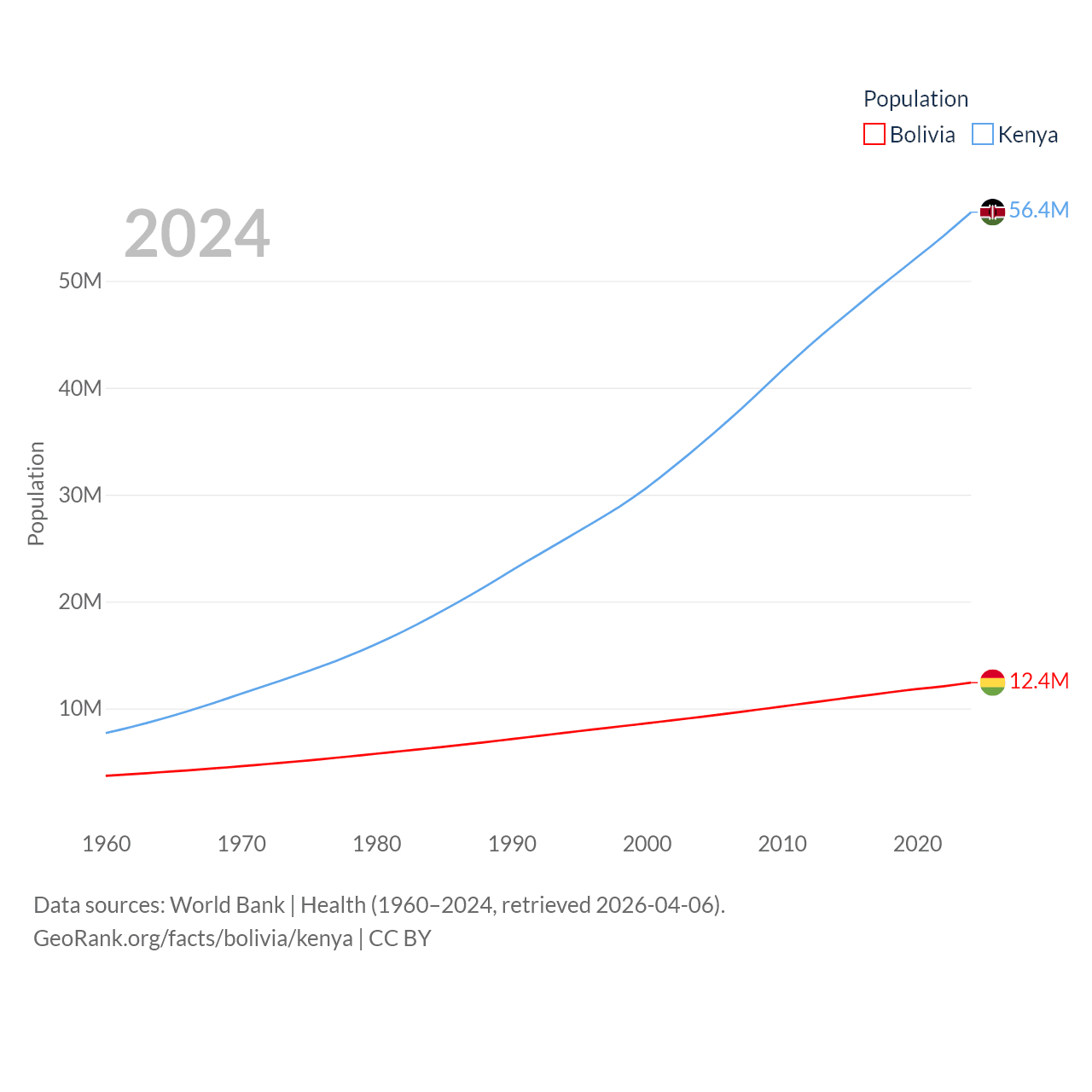 Bolivia has a population of 12.4M (ranked 79/197), compared with 56.4M in Kenya (ranked 26/197). Bolivia's land area is 418,264 sq mi versus 224,278 sq mi for Kenya (ranked 27th vs. 45th).