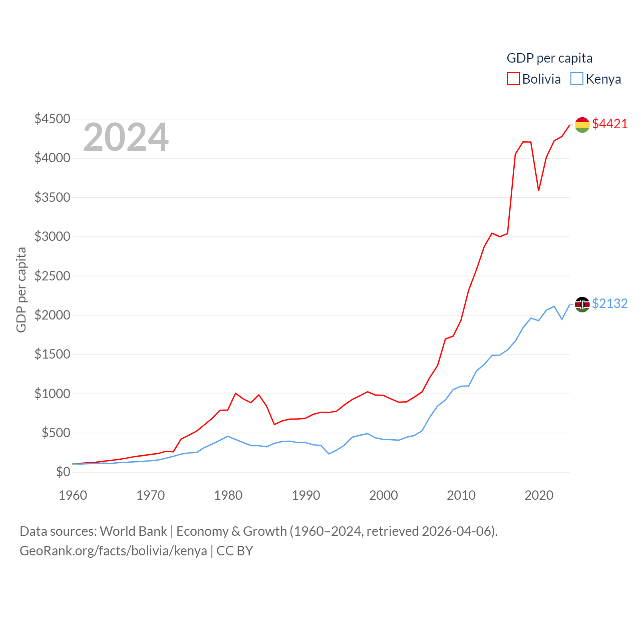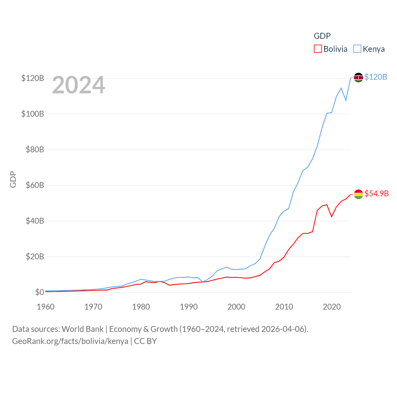 By GDP, Bolivia ranks 88/197 ($54.9B) and Kenya ranks 64/197 ($120B). By GDP per capita, Bolivia ranks 125/197 ($4,421), while Kenya ranks 154/197 ($2,132).