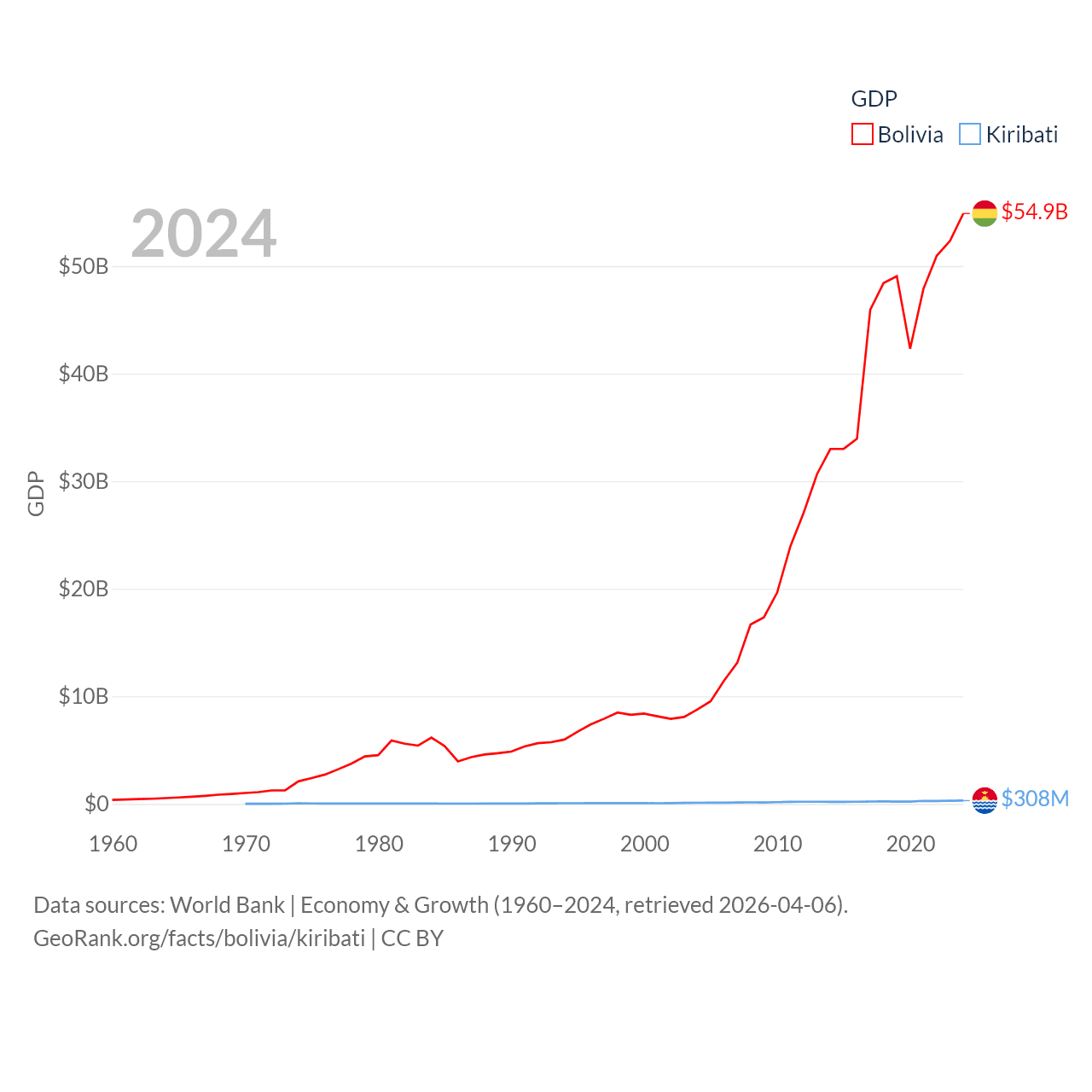 By GDP, Bolivia ranks 88/197 ($54.9B) and Kiribati ranks 192/197 ($308M). By GDP per capita, Bolivia ranks 125/197 ($4,421), while Kiribati ranks 152/197 ($2,289).