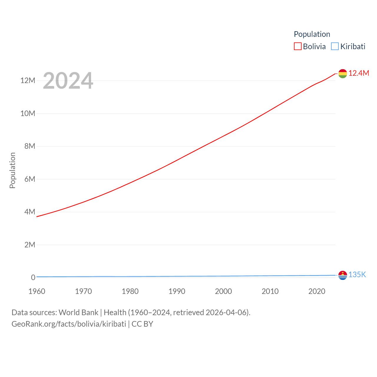 Bolivia has a population of 12.4M (ranked 79/197), compared with 135K in Kiribati (ranked 180/197). Bolivia's land area is 418,264 sq mi versus 313 sq mi for Kiribati (ranked 27th vs. 173rd).