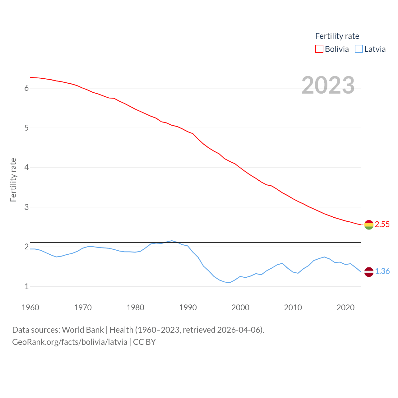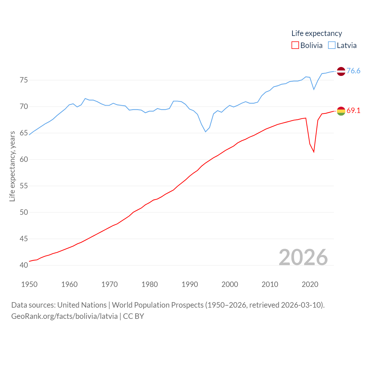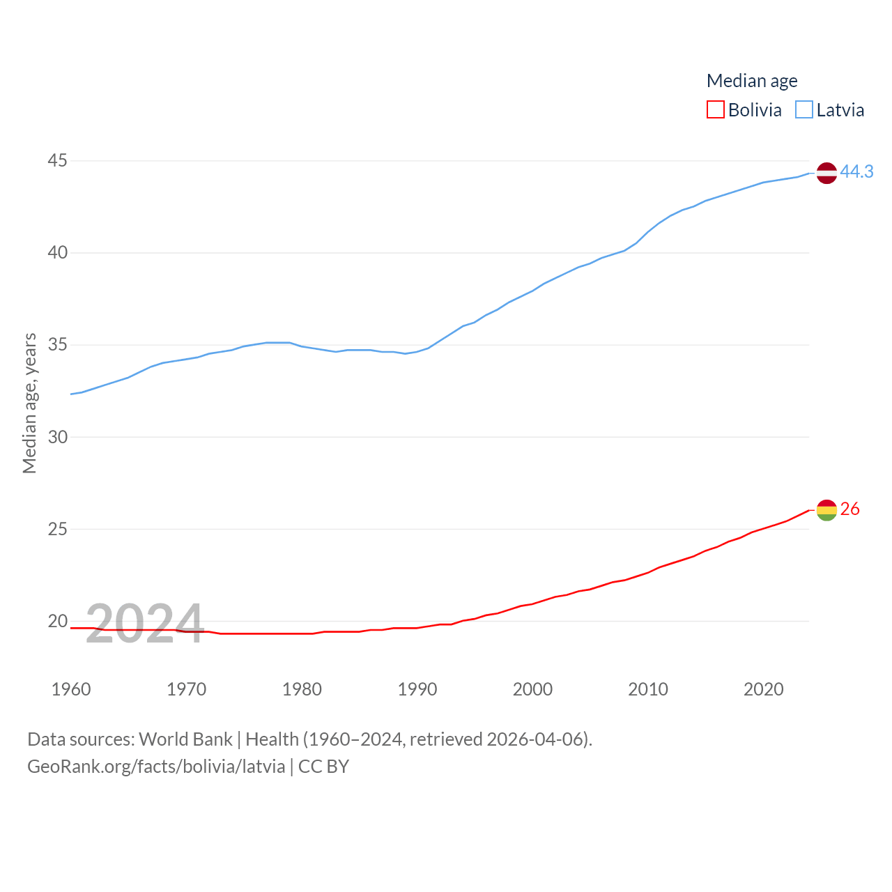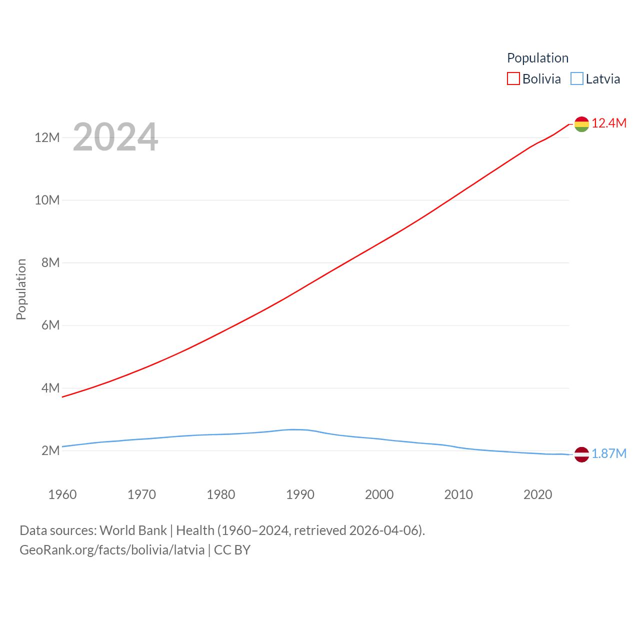 Bolivia has a population of 12.4M (ranked 79/197), compared with 1.87M in Latvia (ranked 149/197). Bolivia's land area is 418,264 sq mi versus 24,027 sq mi for Latvia (ranked 27th vs. 121st).