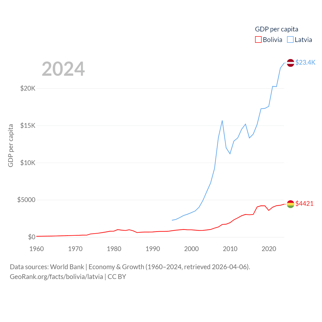By GDP, Bolivia ranks 88/197 ($54.9B) and Latvia ranks 99/197 ($43.7B). By GDP per capita, Bolivia ranks 125/197 ($4,421), while Latvia ranks 54/197 ($23,409).