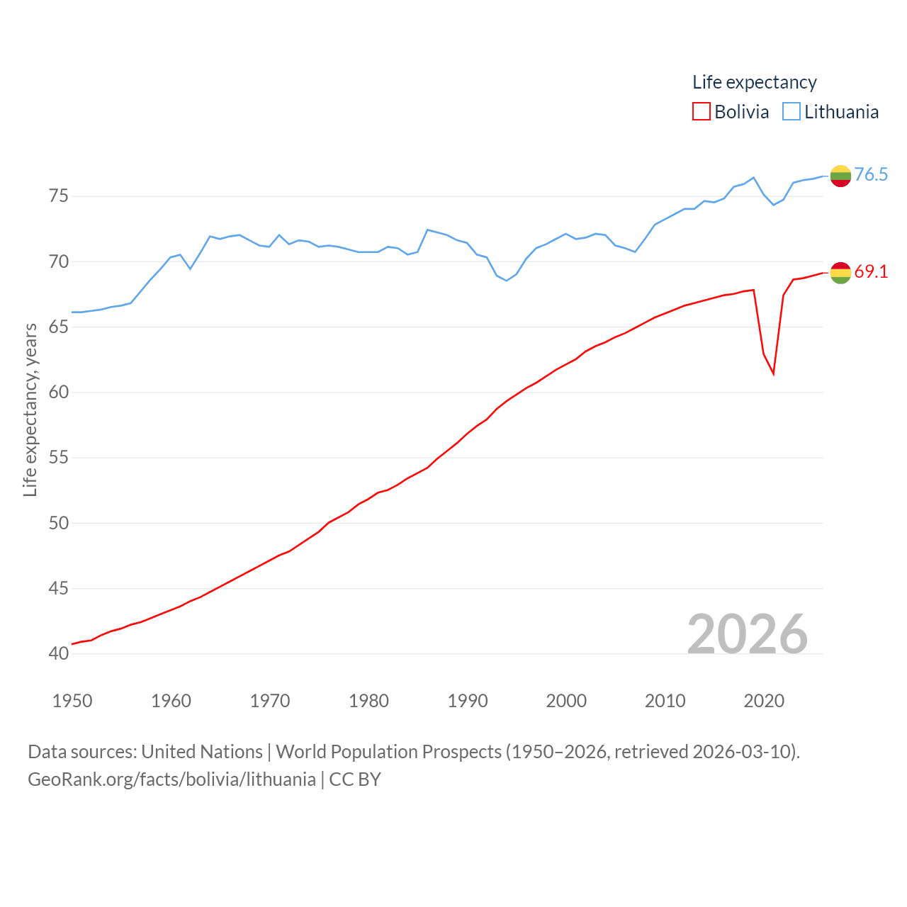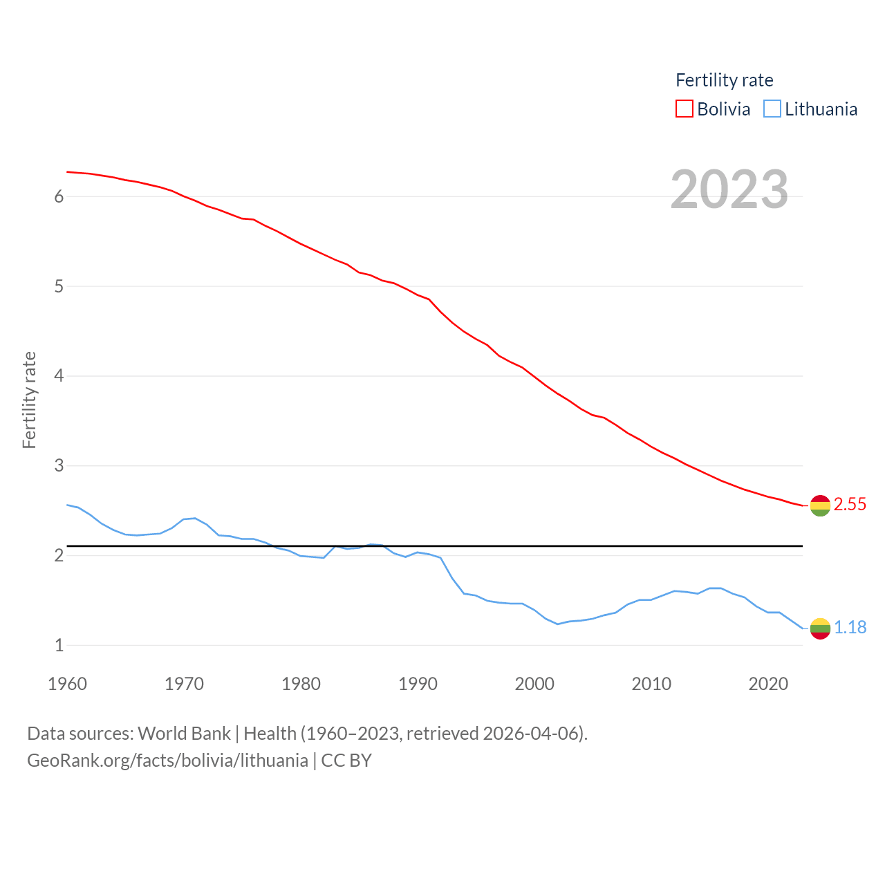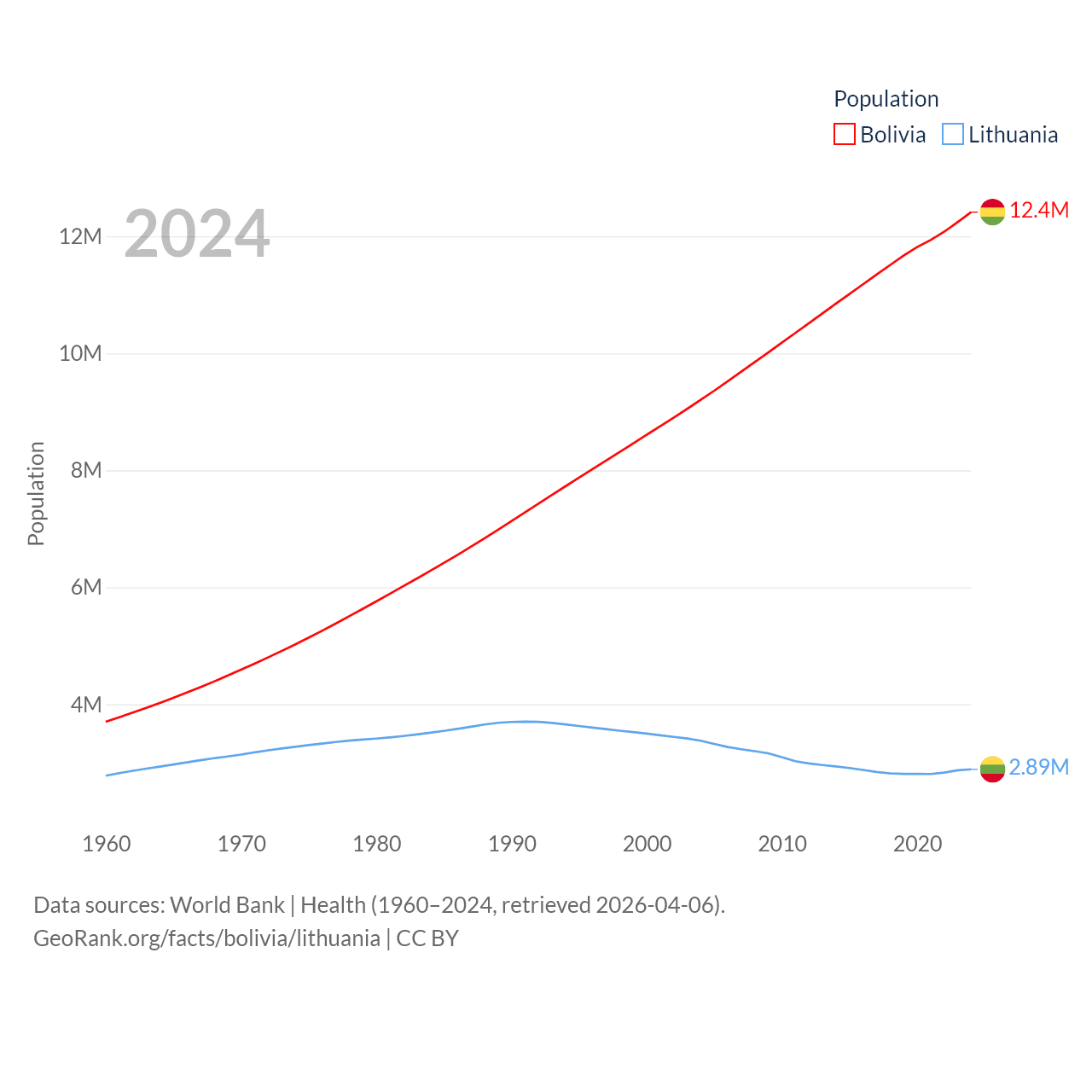 Bolivia has a population of 12.4M (ranked 79/197), compared with 2.89M in Lithuania (ranked 137/197). Bolivia's land area is 418,264 sq mi versus 24,170 sq mi for Lithuania (ranked 27th vs. 120th).