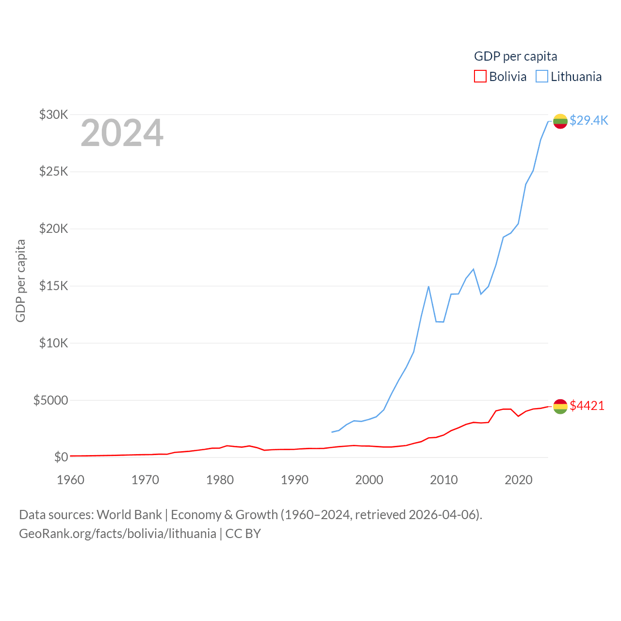 By GDP, Bolivia ranks 88/197 ($54.9B) and Lithuania ranks 79/197 ($84.9B). By GDP per capita, Bolivia ranks 125/197 ($4,421), while Lithuania ranks 43/197 ($29,384).