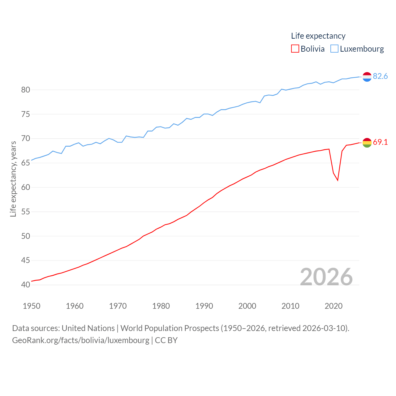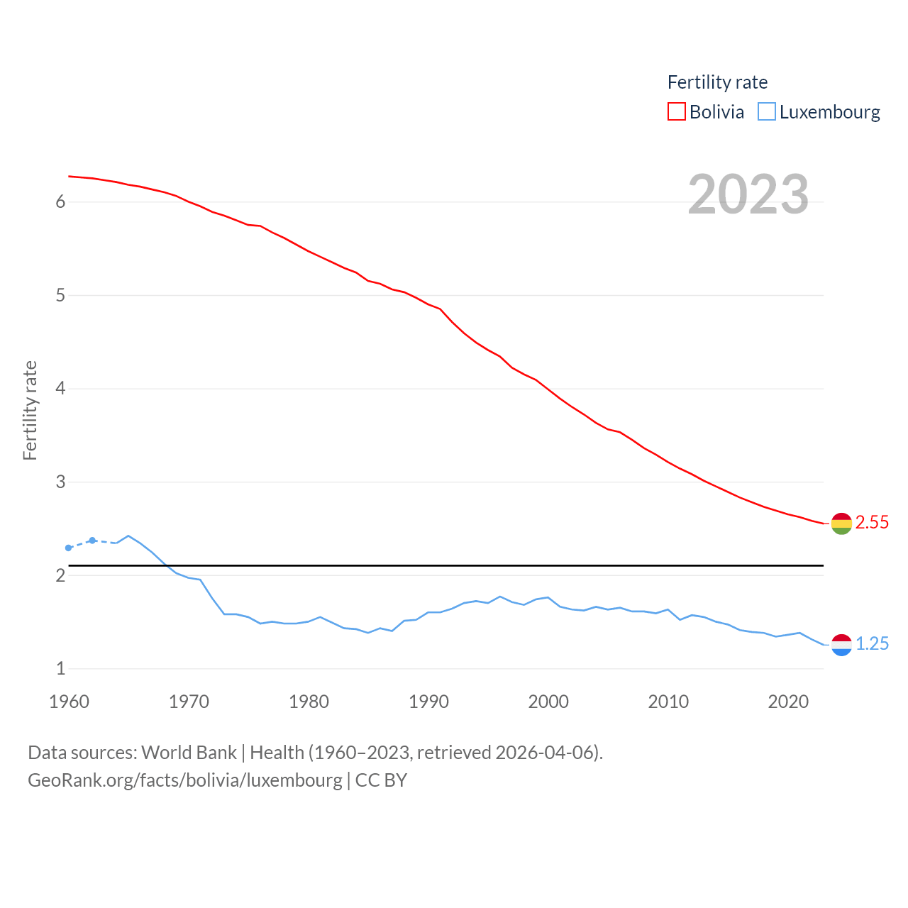 Bolivia has a population of 12.4M (ranked 79/197), compared with 677K in Luxembourg (ranked 164/197). Bolivia's land area is 418,264 sq mi versus 994 sq mi for Luxembourg (ranked 27th vs. 169th).