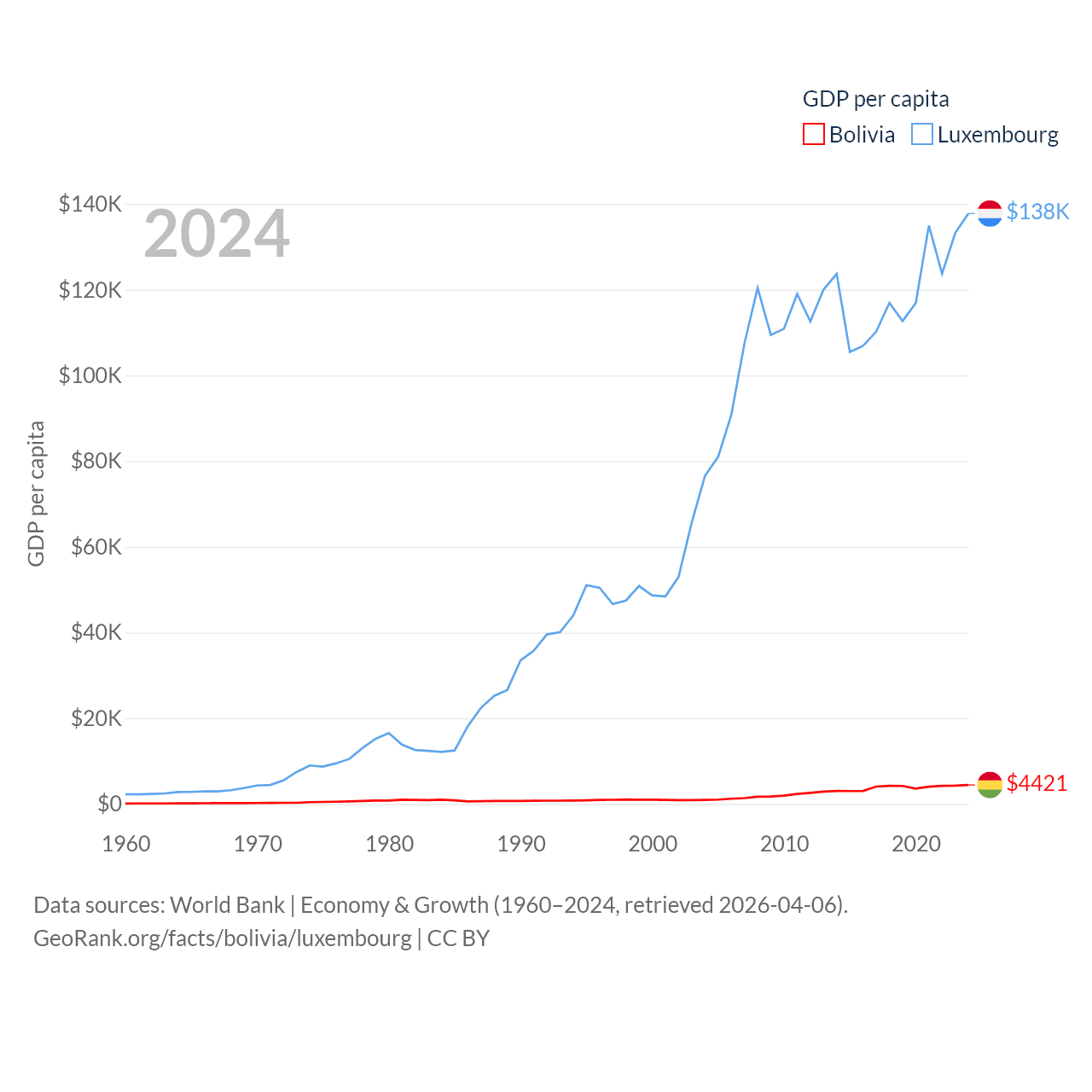 By GDP, Bolivia ranks 88/197 ($54.9B) and Luxembourg ranks 74/197 ($93.3B). By GDP per capita, Bolivia ranks 125/197 ($4,421), while Luxembourg ranks 3/197 ($137,782).