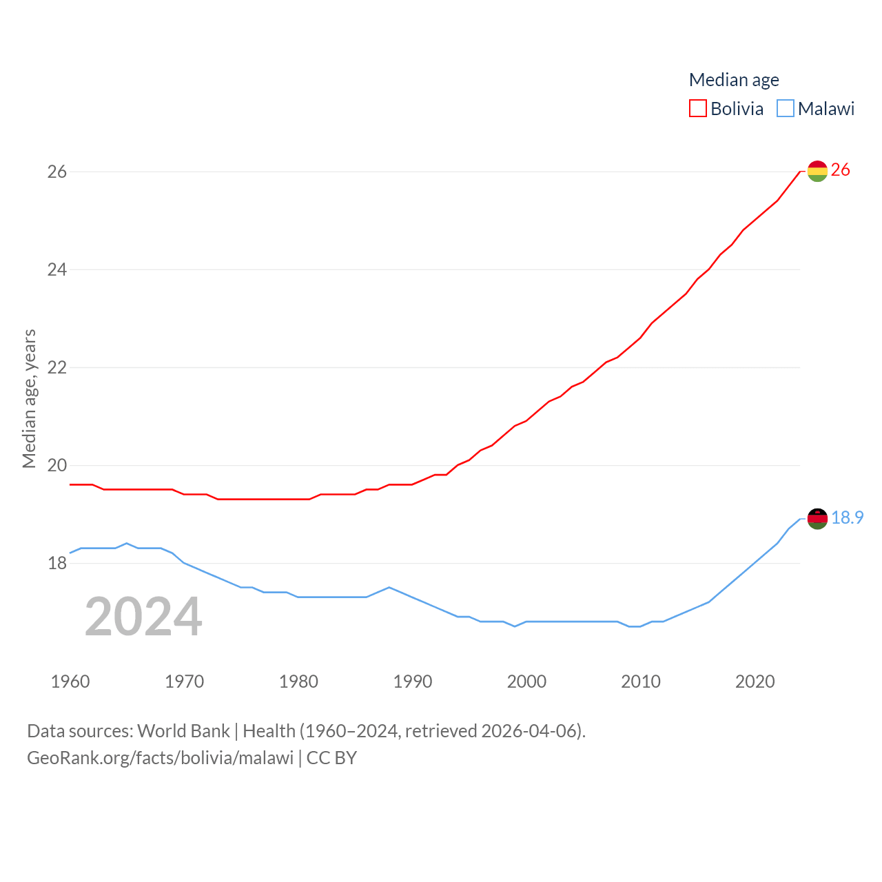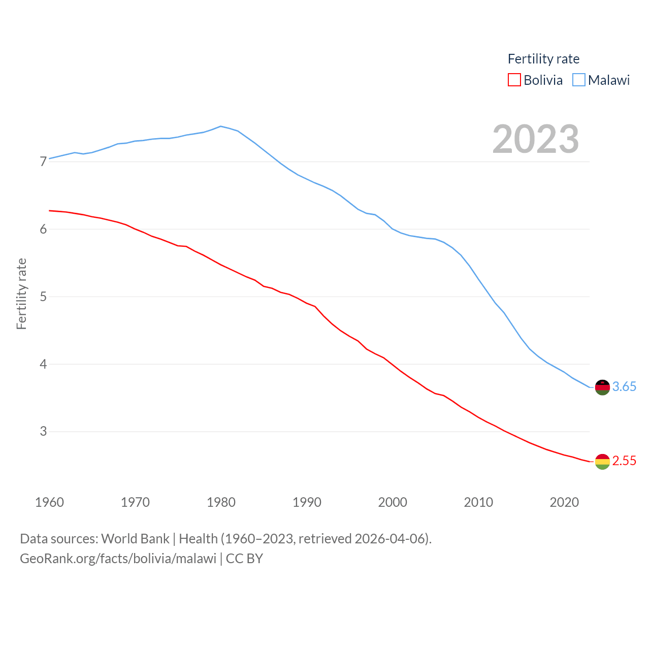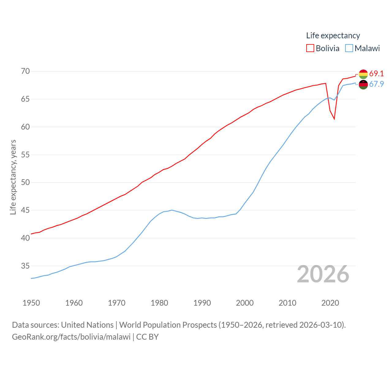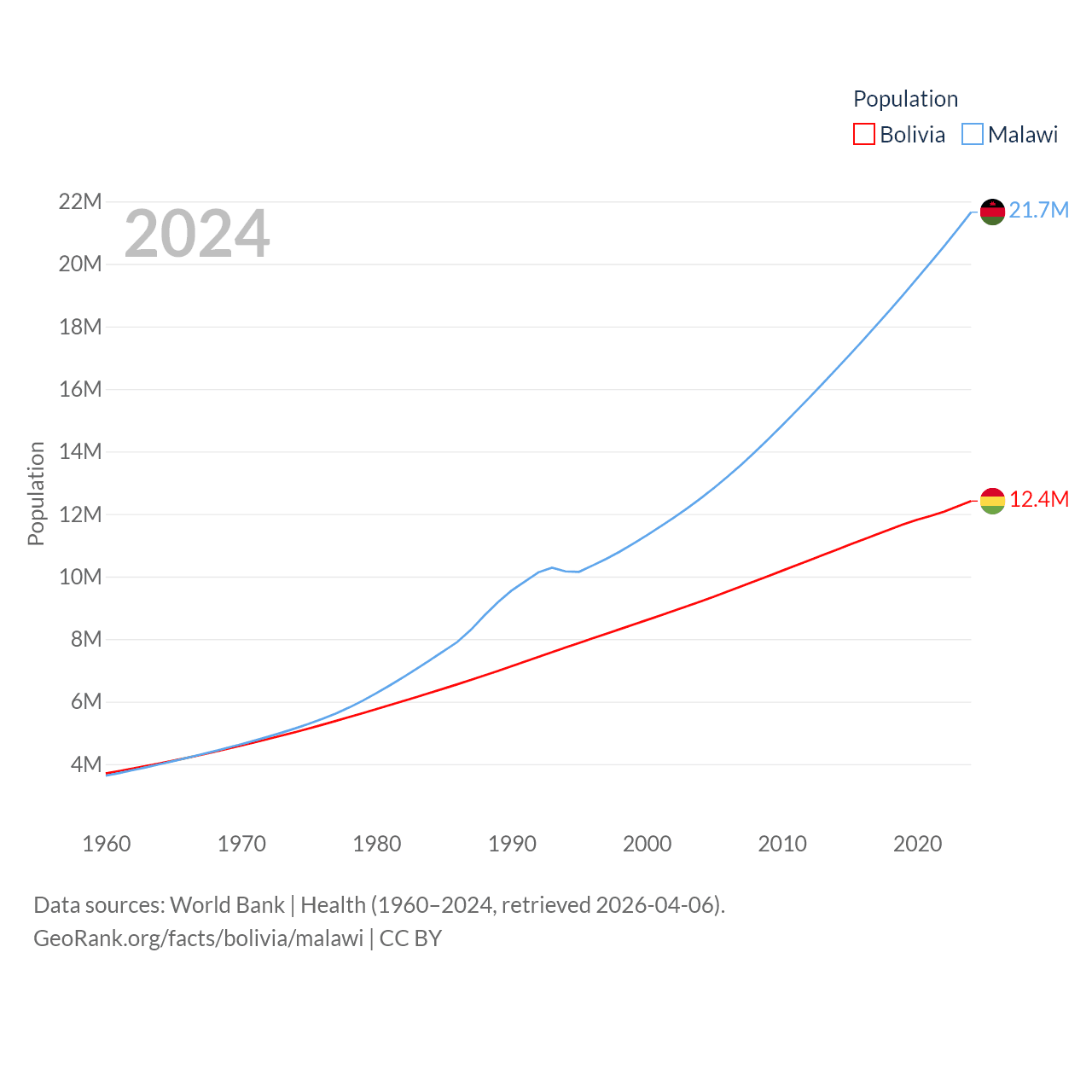 Bolivia has a population of 12.4M (ranked 79/197), compared with 21.7M in Malawi (ranked 62/197). Bolivia's land area is 418,264 sq mi versus 36,402 sq mi for Malawi (ranked 27th vs. 107th).