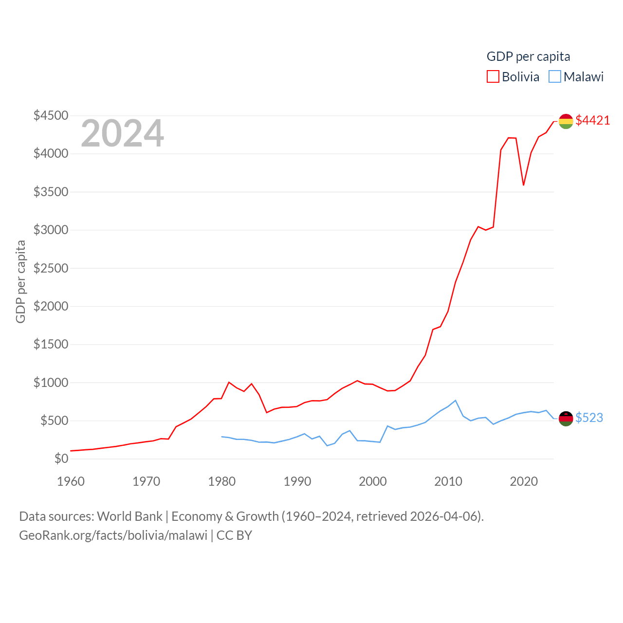By GDP, Bolivia ranks 88/197 ($54.9B) and Malawi ranks 151/197 ($11.3B). By GDP per capita, Bolivia ranks 125/197 ($4,421), while Malawi ranks 194/197 ($523).