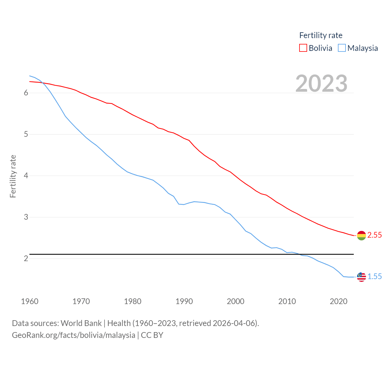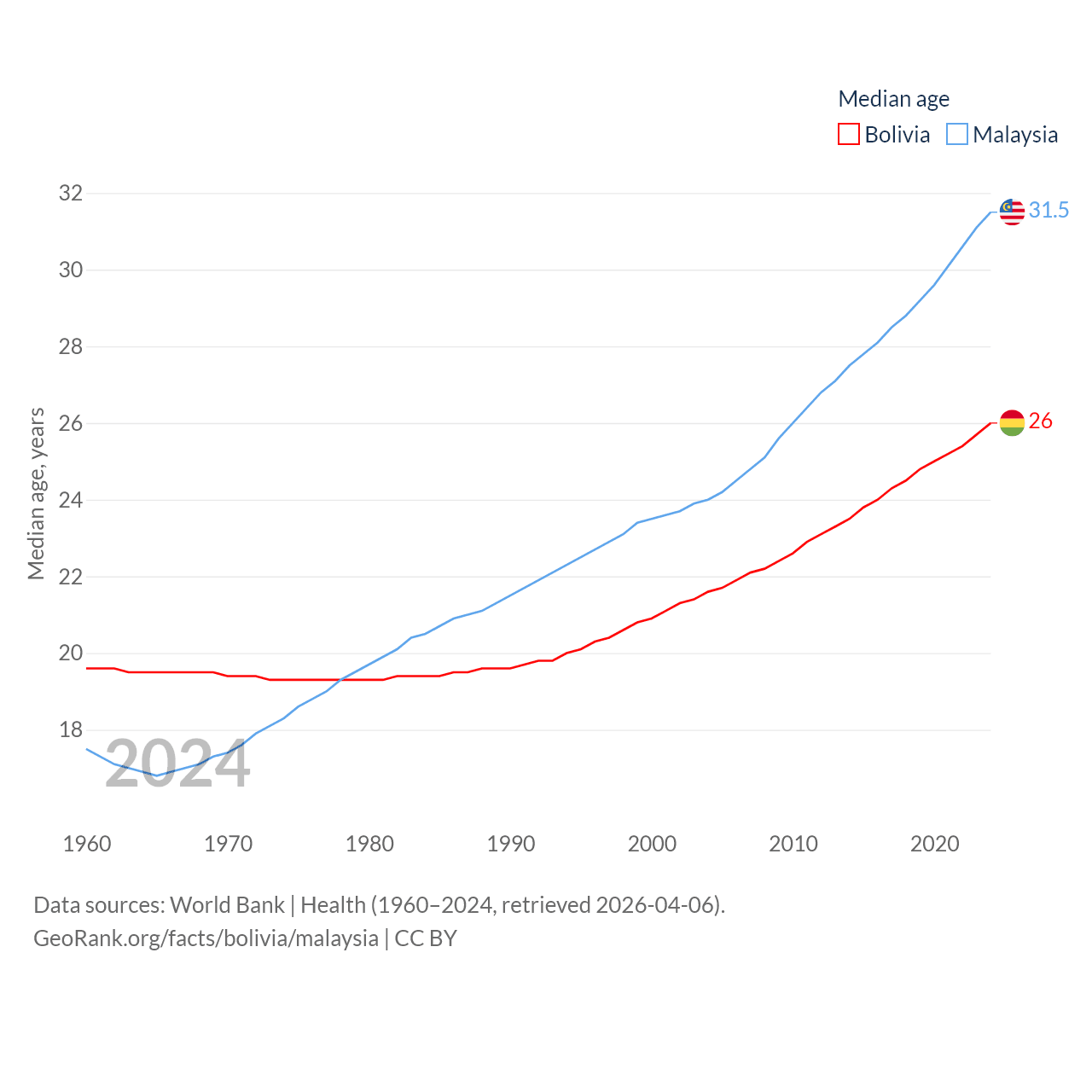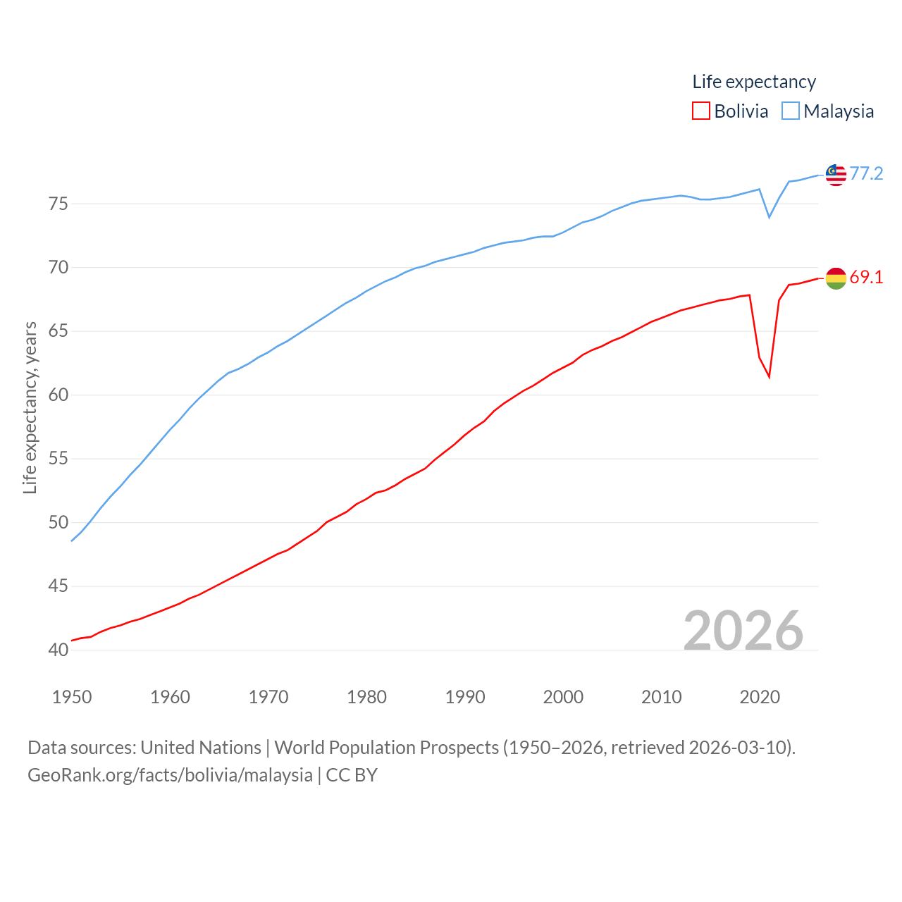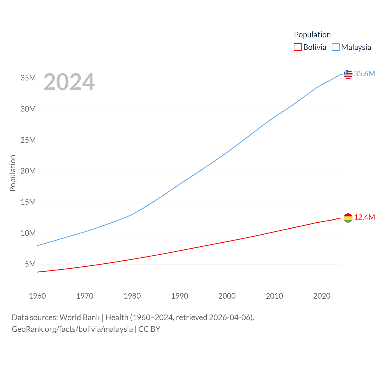 Bolivia has a population of 12.4M (ranked 79/197), compared with 35.6M in Malaysia (ranked 44/197). Bolivia's land area is 418,264 sq mi versus 126,854 sq mi for Malaysia (ranked 27th vs. 65th).