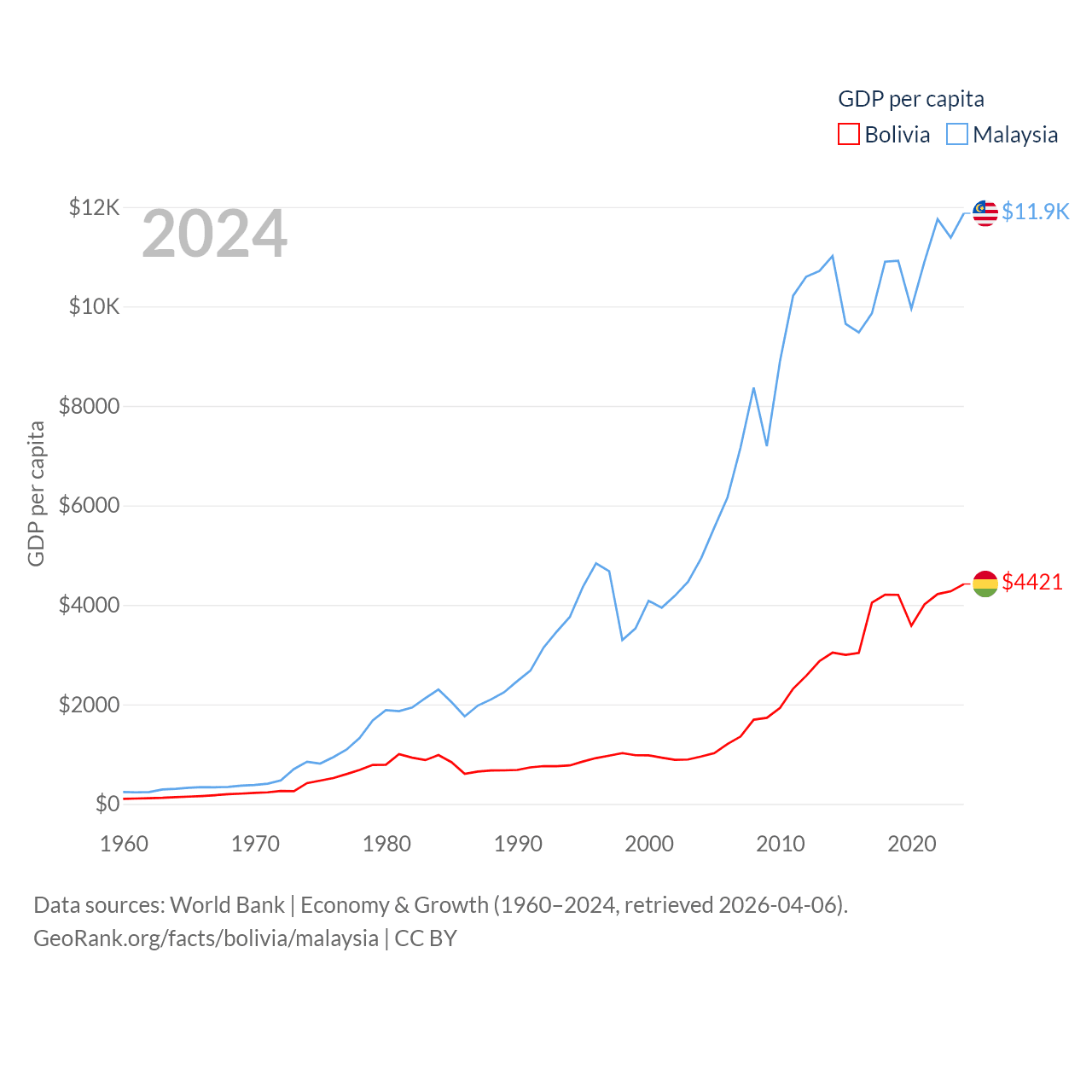 By GDP, Bolivia ranks 88/197 ($54.9B) and Malaysia ranks 38/197 ($422B). By GDP per capita, Bolivia ranks 125/197 ($4,421), while Malaysia ranks 79/197 ($11,874).