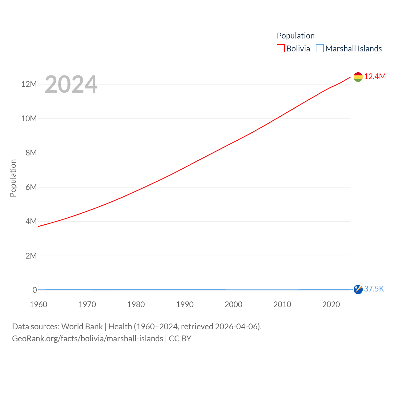 Bolivia has a population of 12.4M (ranked 79/197), compared with 37.5K in The Marshall Islands (ranked 192/197). Bolivia's land area is 418,264 sq mi versus 69.5 sq mi for The Marshall Islands (ranked 27th vs. 191st).