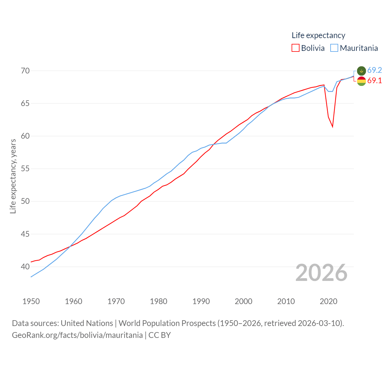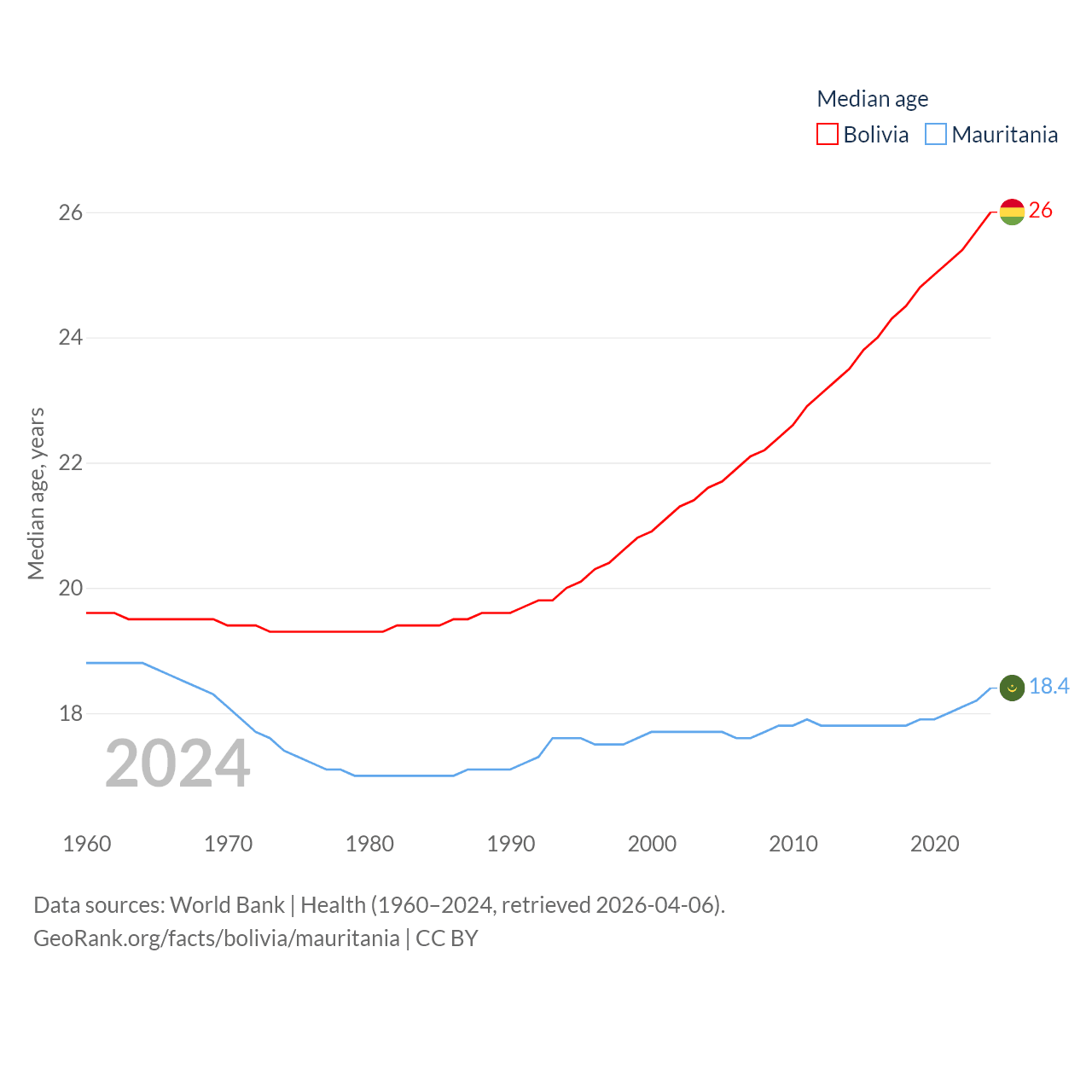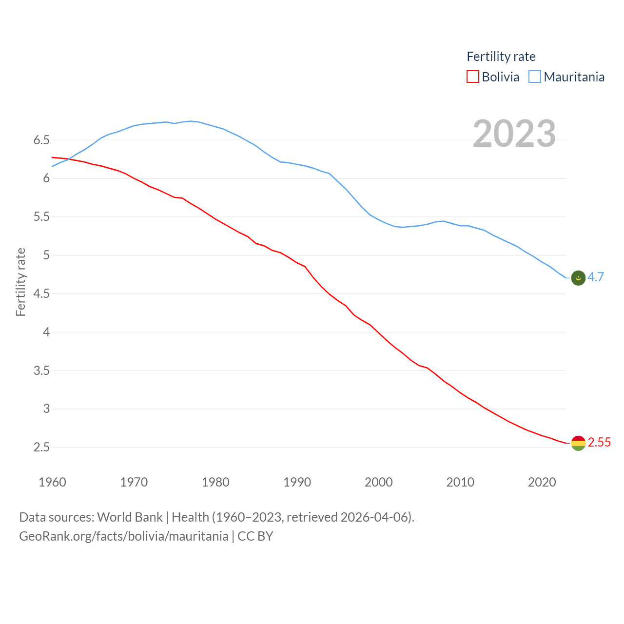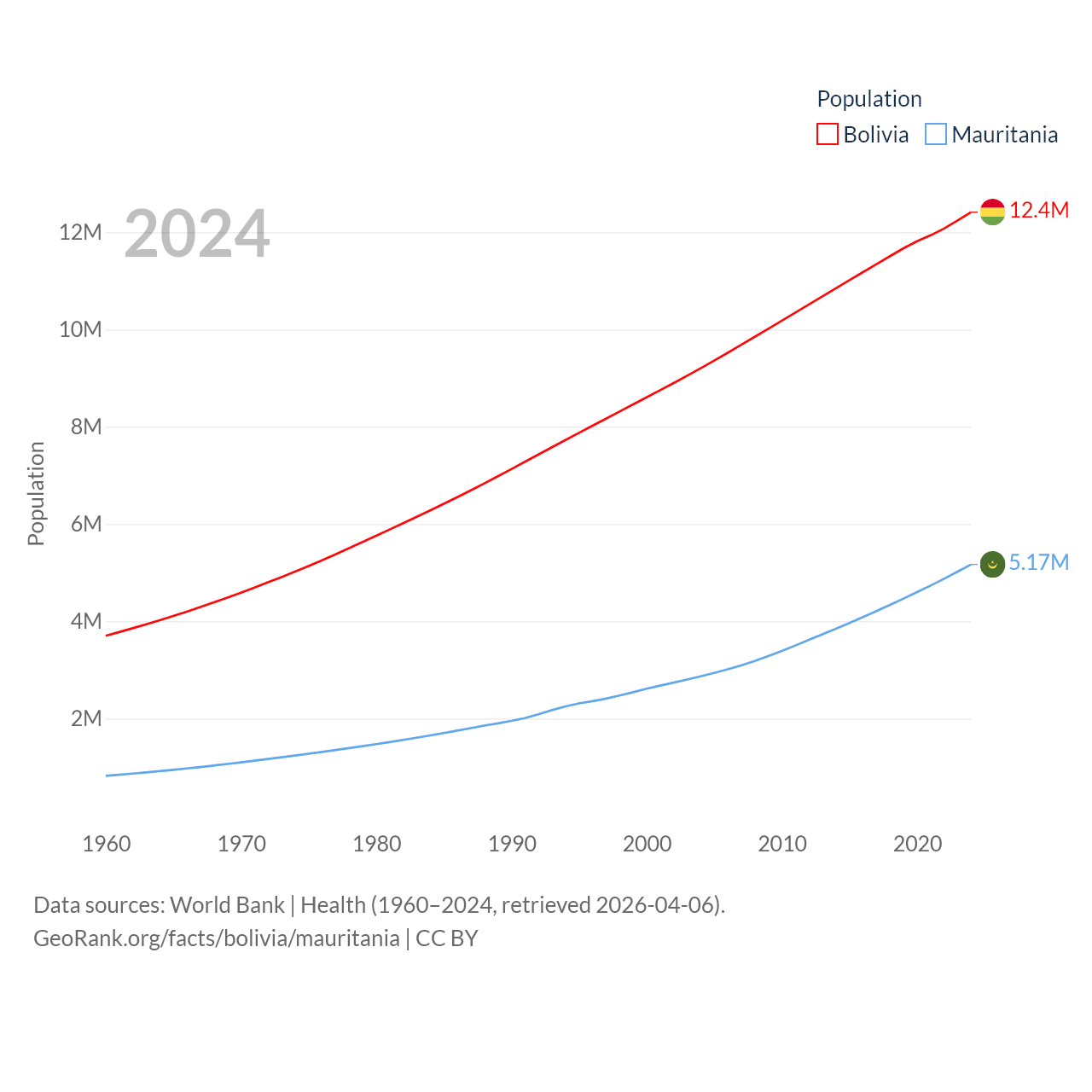 Bolivia has a population of 12.4M (ranked 79/197), compared with 5.17M in Mauritania (ranked 125/197). Bolivia's land area is 418,264 sq mi versus 397,955 sq mi for Mauritania (ranked 27th vs. 28th).