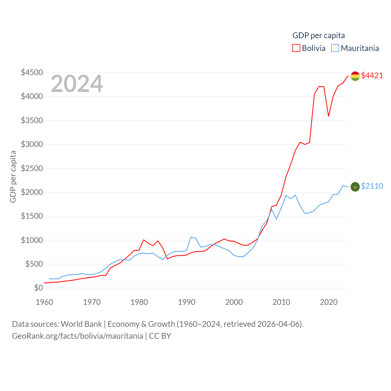 By GDP, Bolivia ranks 88/197 ($54.9B) and Mauritania ranks 153/197 ($10.9B). By GDP per capita, Bolivia ranks 125/197 ($4,421), while Mauritania ranks 156/197 ($2,110).