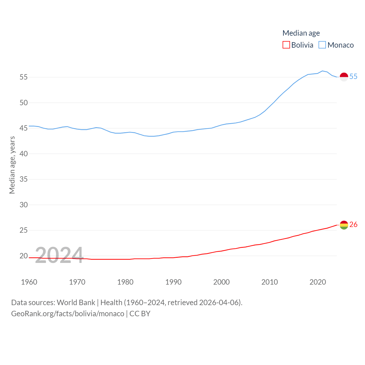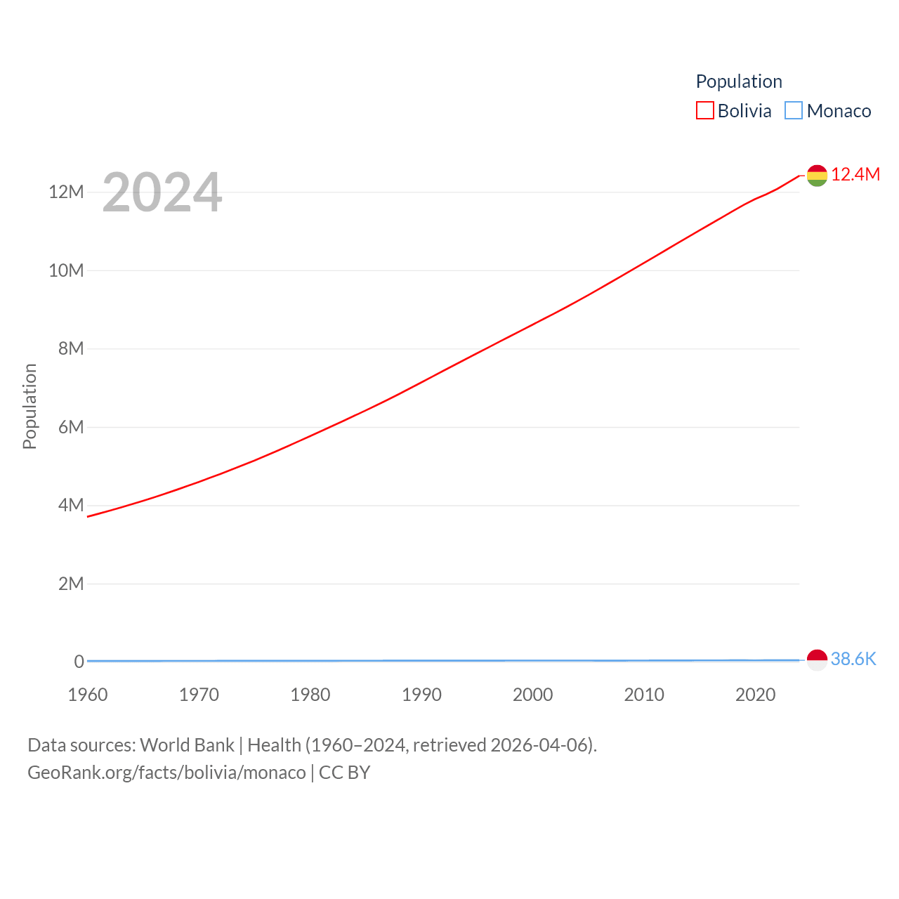 Bolivia has a population of 12.4M (ranked 79/197), compared with 38.6K in Monaco (ranked 191/197). Bolivia's land area is 418,264 sq mi versus 0.8 sq mi for Monaco (ranked 27th vs. 196th).
