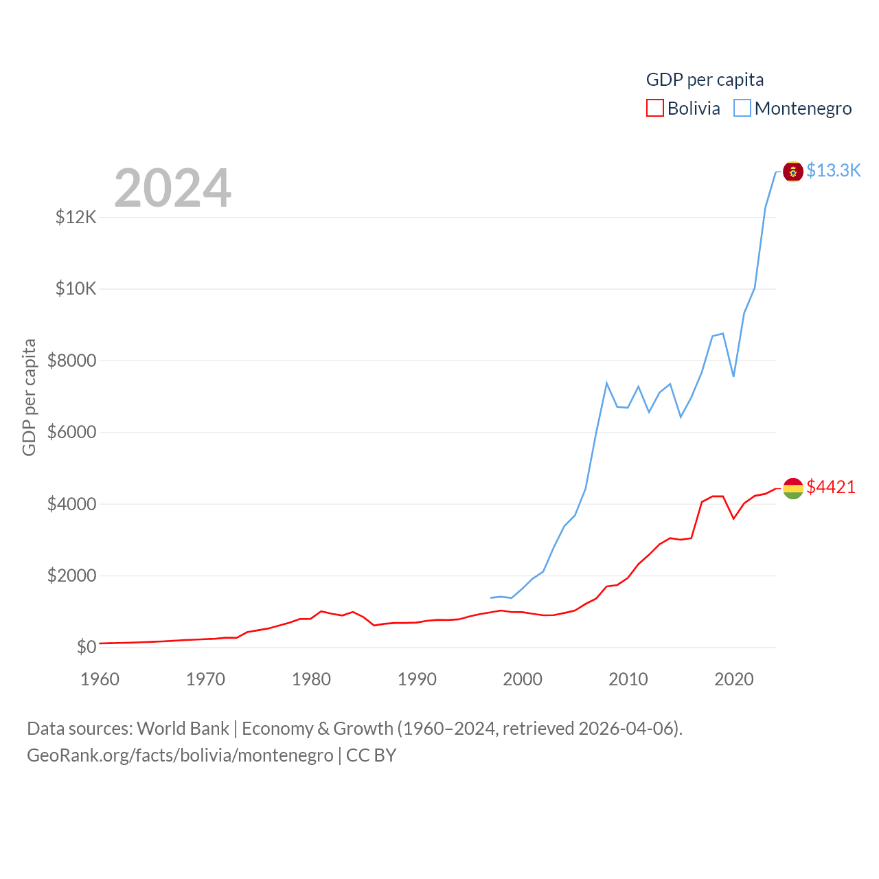 By GDP, Bolivia ranks 88/197 ($54.9B) and Montenegro ranks 155/197 ($8.27B). By GDP per capita, Bolivia ranks 125/197 ($4,421), while Montenegro ranks 77/197 ($13,263).