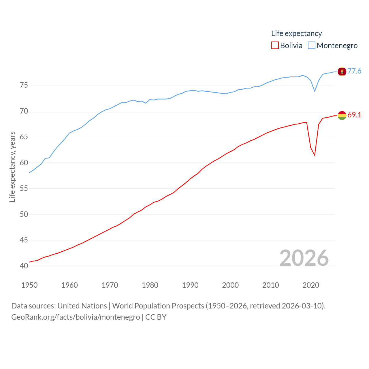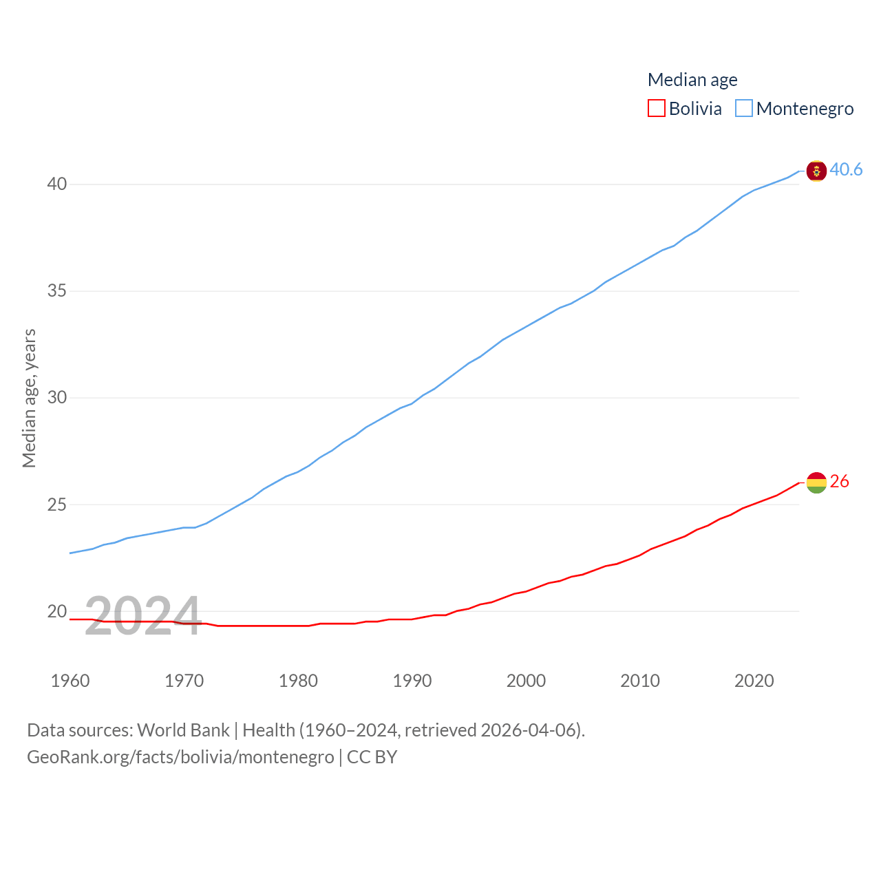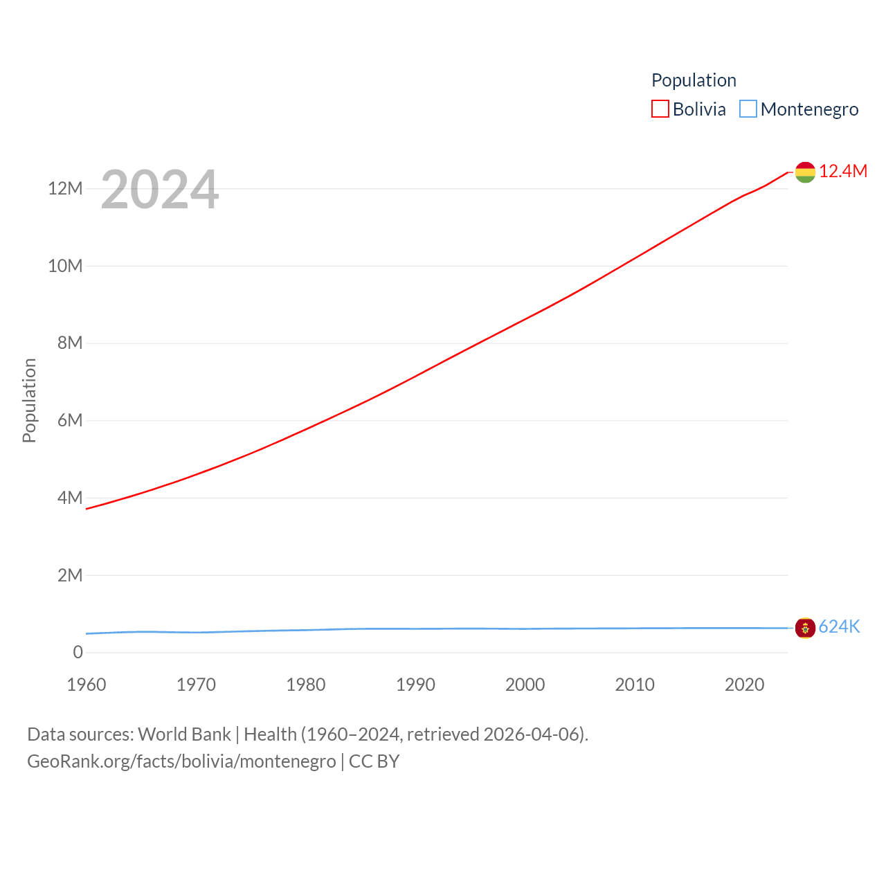 Bolivia has a population of 12.4M (ranked 79/197), compared with 624K in Montenegro (ranked 166/197). Bolivia's land area is 418,264 sq mi versus 5,193 sq mi for Montenegro (ranked 27th vs. 156th).