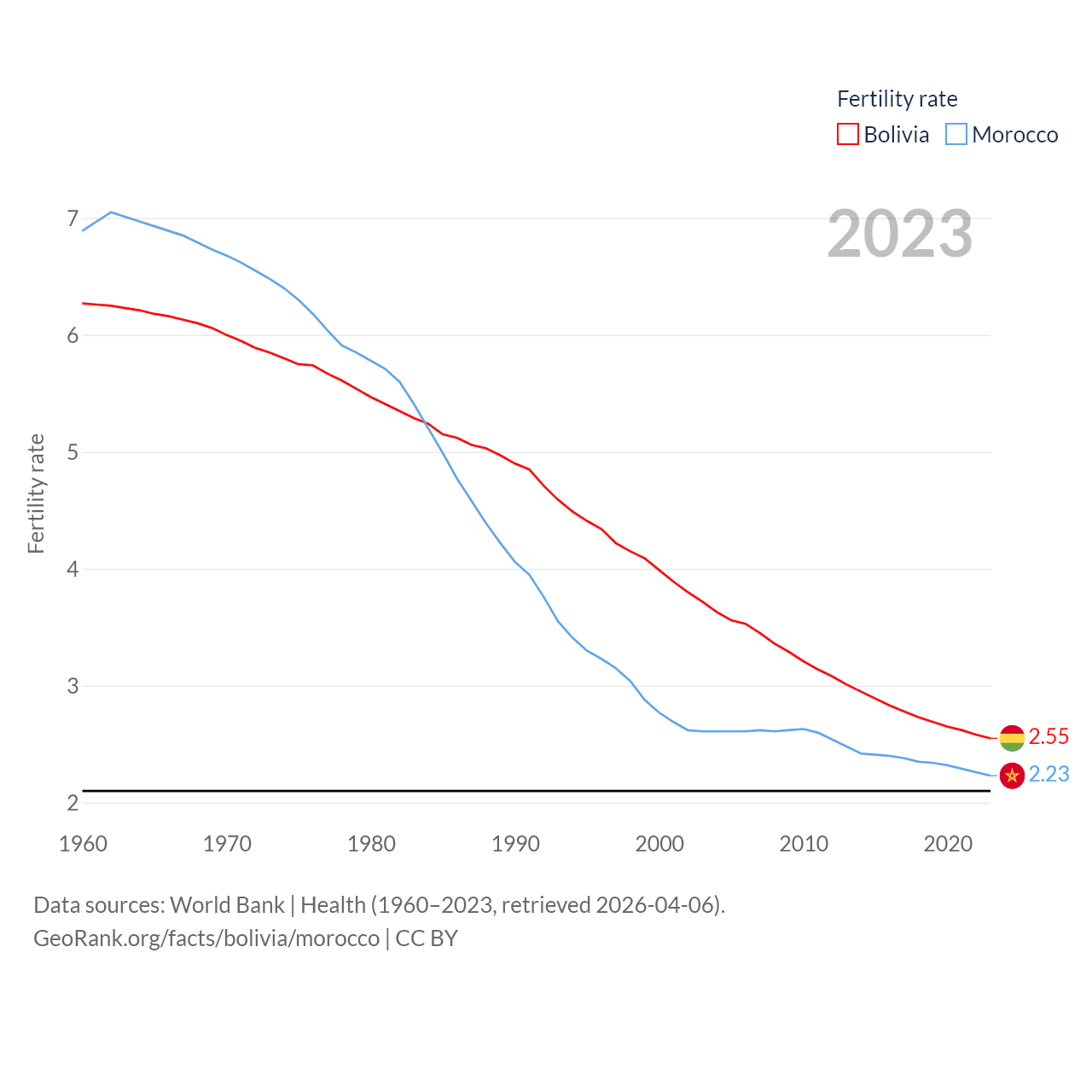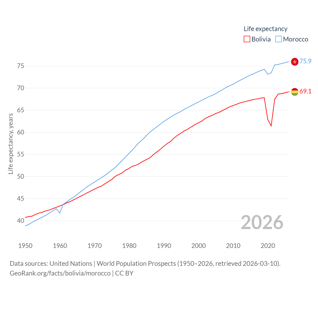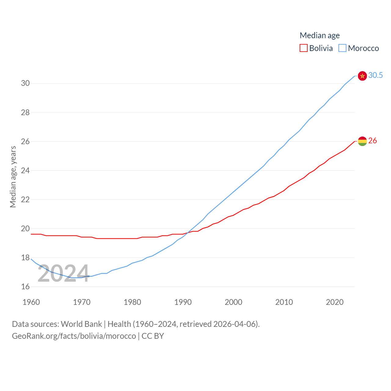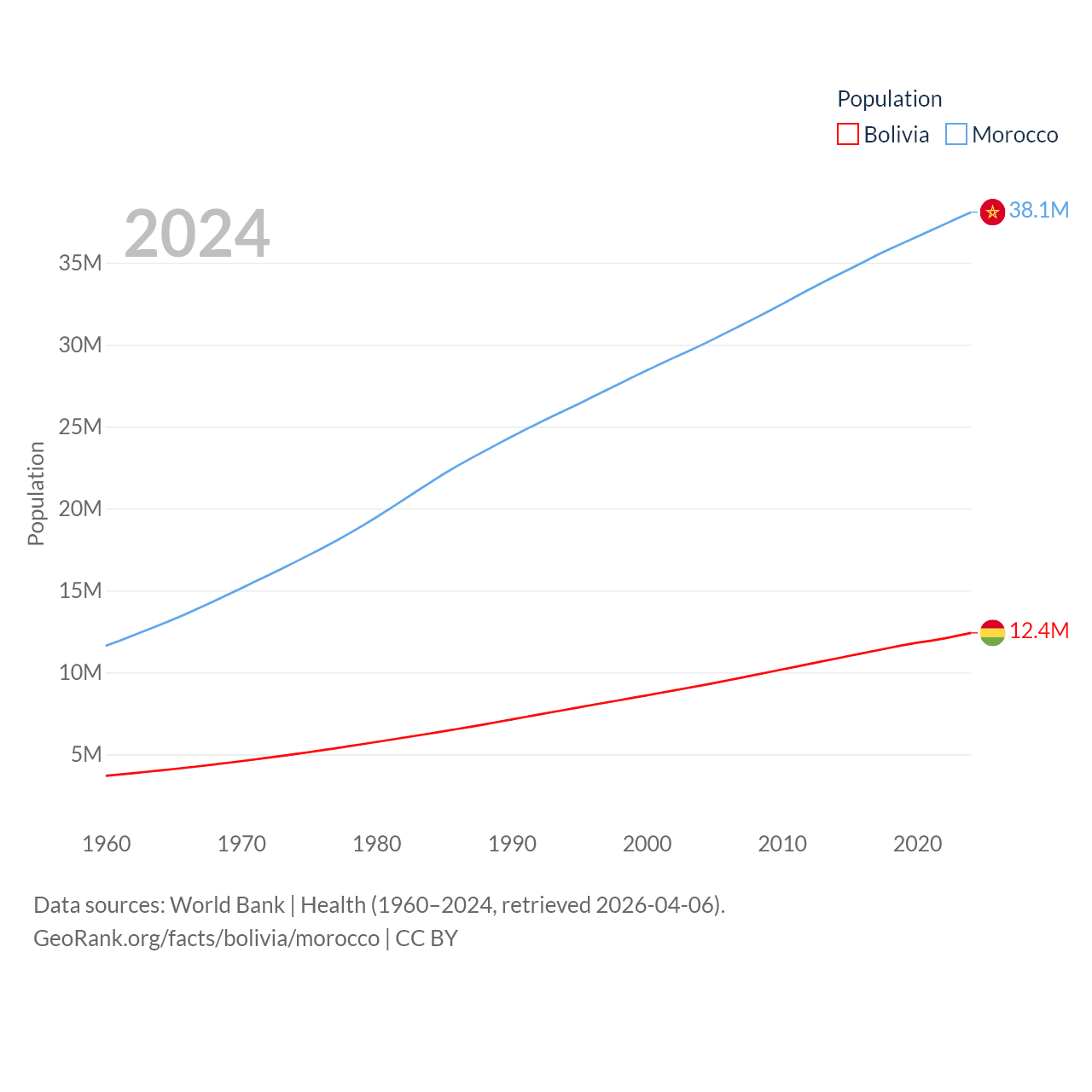 Bolivia has a population of 12.4M (ranked 79/197), compared with 38.1M in Morocco (ranked 39/197). Bolivia's land area is 418,264 sq mi versus 172,317 sq mi for Morocco (ranked 27th vs. 55th).