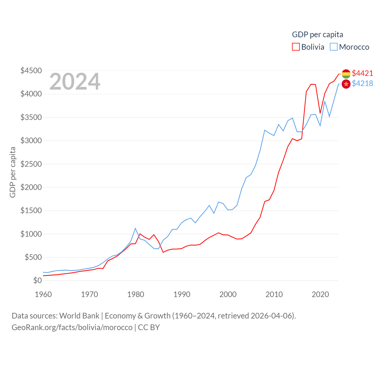 By GDP, Bolivia ranks 88/197 ($54.9B) and Morocco ranks 58/197 ($161B). By GDP per capita, Bolivia ranks 125/197 ($4,421), while Morocco ranks 127/197 ($4,218).