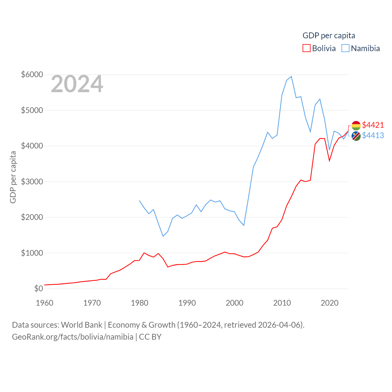 By GDP, Bolivia ranks 88/197 ($54.9B) and Namibia ranks 147/197 ($13.4B). By GDP per capita, Bolivia ranks 125/197 ($4,421), while Namibia ranks 126/197 ($4,413).