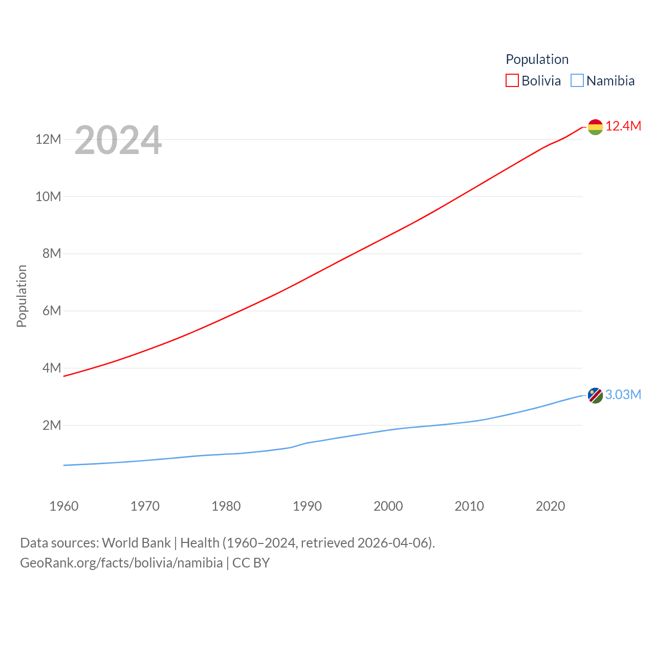 Bolivia has a population of 12.4M (ranked 79/197), compared with 3.03M in Namibia (ranked 136/197). Bolivia's land area is 418,264 sq mi versus 317,874 sq mi for Namibia (ranked 27th vs. 33rd).