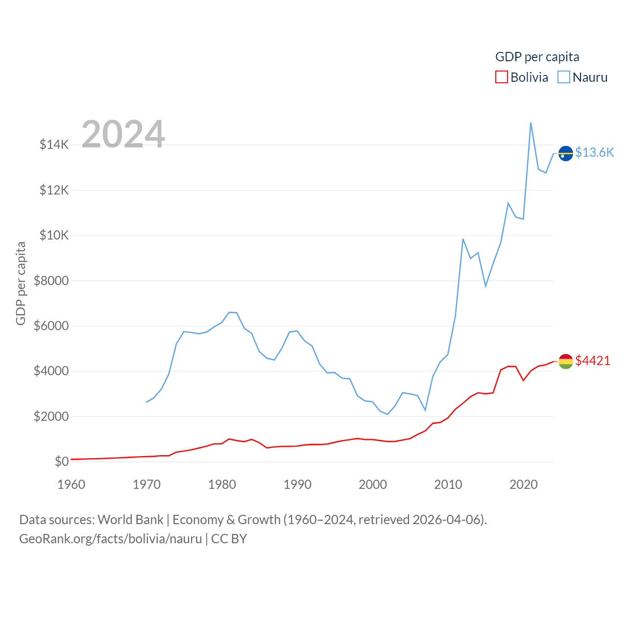 By GDP, Bolivia ranks 88/197 ($54.9B) and Nauru ranks 195/197 ($163M). By GDP per capita, Bolivia ranks 125/197 ($4,421), while Nauru ranks 74/197 ($13,609).